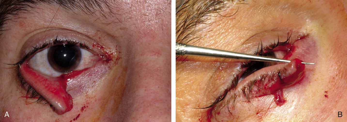Flaccid Canaliculus Syndrome The flaccid canaliculus syndrome was described by Jones and Wobig.43 Involutional changes may produce a nasolacrimal system that appears open to irrigation. However, lid laxity and poor lacrimal pump function contribute to poor tear drainage. Horizontal shortening of the lid may help, but frequently, a Jones tube combined with DCR is required. Again, caution must be exercised to ensure that the patient does not have an underlying dry-eye problem. If so, reflex tearing will continue and the patient may be unhappy. Irritation from Lashes Trichiasis and distichiasis are causes of reflex tearing, as previously discussed. These problems can be managed by cryosurgery, electrolysis, or a variety of lid margin procedures. Likewise, entropion can cause reflex tearing secondary to lash irritation. Rotation of the lid margin or other standard entropion procedures can eliminate these causes of epiphora.46–49 TRAUMA Trauma can occur at any site in the nasolacrimal drainage system. The form of trauma can range from chemical and thermal burns to avulsions and lacerations. Burns Whatever the source of energy causing a burn, the treatment is much the same to repair punctal or canalicular stenosis. Silastic stenting is required more frequently when the initial injury was thermal. The stenting also must be left in place for much longer than the usual period. Lacerations Lacerations of the punctum are rare, and those to the sac alone can be repaired primarily. The most common form of laceration to the nasolacrimal drainage system is the canalicular laceration. The guiding principle in the repair of the canaliculus is to reestablish the patency of the damaged system. The surgeon should minimize further trauma to the nasolacrimal system and be cognizant of the cosmetic details. Use of the pigtail probe in the repair must be used cautiously because it can too easily damage the sac and common internal punctum. The operating microscope assists in visualization of the lacerated ends and is highly recommended for surgical management. If the surgeon is more comfortable with high-power loupes, use of the operating microscope may be unnecessary. In fact, loupes may be more advantageous because the surgeon may have a greater field of vision and more mobility while repairing the laceration. The proximal or lateral end is located easily by passing a probe through the punctum (Fig. 12A and 12B). The medial or distal end usually can be identified easily with the use of the magnification. When both upper and lower canaliculi are cut near the sac, identification may be difficult. When a single canaliculus is cut, the use of a milky white steroid–antibiotic suspension injected through the intact canaliculus can assist in locating a cut end. Air can be injected in a similar fashion under a pool of saline, and the resultant bubbles can assist in localizing the distal end. The use of the operating microscope under high power has made these maneuvers unnecessary in most cases.