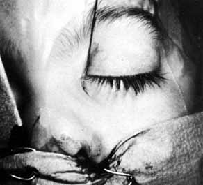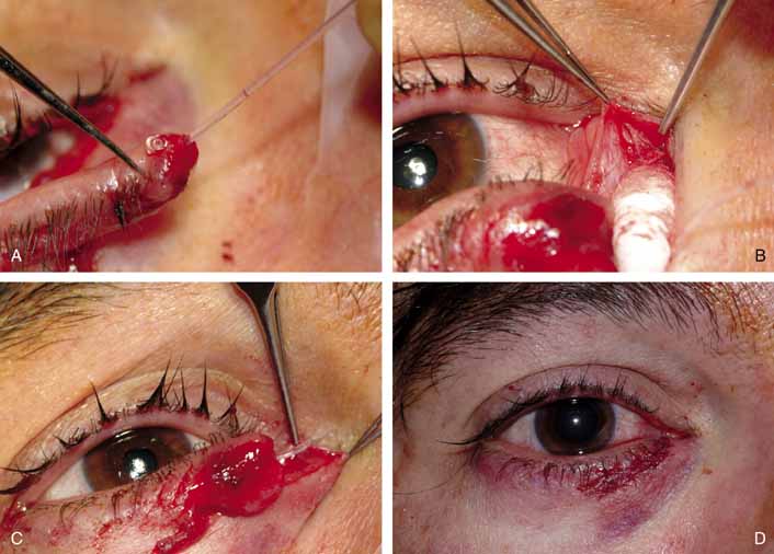 Surgical technique for the repair of lid lacerations has evolved to Silastic intubation of the nasolacrimal system.6 Either monocanalicular or bicanalicular stents can be inserted (Fig 13A, 13B, 13C, and 13D). The Silastic material moves easily and does not prohibit the lid from blinking normally. The flexibility of the tubing also allows for simpler anastomosis of the lacerated ends of the canaliculus. With Silastic intubation, 7–0 absorbable sutures can be placed submucosally (Fig. 14). The Silastic is placed into the nasolacrimal duct as described for pediatric dacryostenosis, and the canaliculus is repaired around the stent. If the laceration is in the medial canthal tendon area, repair of the deep and superficial heads of the pretarsal muscle should be done.6 The lid can further be supported by a mattress-type suture sling using a 4.0 vicryl on a P2 needle, transnasal wiring, or a supramid suture on a ski needle (Figs. 15 and 16). The orbicularis and skin are closed in layers with appropriate sutures. The Silastic tubing should be left in place for 4 to 6 months, if possible. Lack of epiphora is a positive sign indicating that the tears are passing despite the cicatrix from the laceration. The tears pass around the silastic tube into the nasolacrimal sac and exit from the duct. Unless chronic infection mandates removal, tubing should remain in place until symptoms or epiphora cease. A good rule of thumb is that the closer the laceration is to the punctum, the earlier the tube can be removed.