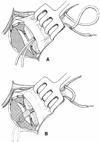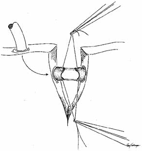 As for the monocanalicular stents, our preference is to use the Ritleng probe for passage. This hollow probe has a directed groove at the distal tip (Fig. 25A and 25B). The prolene portion on the Silastic tubing is fed down the probe and recovered from the nose (Fig. 26). Sometimes the directional groove will lead the prolene portion directly out the nostril. It is helpful to feed a majority of the prolene down the probe to facilitate distal recovery. The Ritleng hook, Crawford hook, or myringotomy forceps can be utilized to retrieve the prolene portion from the nose. If any trouble is encountered retrieving the prolene feeder, the surgeon should feel for the Ritleng probe and hook it. Once the hook is around the probe, the probe should be rotated 180 degrees because this will position the distal opening of the probe posteriorly. In addition, the probe should be slightly withdrawn. The hook will engage the prolene feeder when the hook is pulled anteriorly. It is important to note that the prolene thread has two portions, a light blue section and a dark blue section. The darker portion has a thicker diameter. When all the dark prolene has been inserted down the probe, the light blue, thinner portion should be passed outside the slit on the side of the probe. Simultaneously, the probe should be removed proximally from the nasolacrimal system.