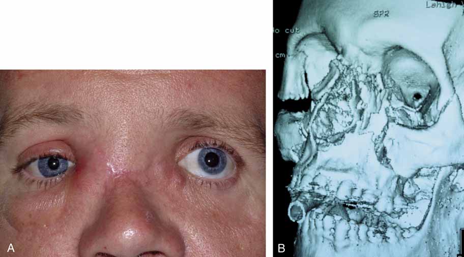 We recommend use of the Monaka or mini-Monaka system (FCI Ophthalmics, Marshall Hills, MA) for monocanalicular trauma. The mini-Monaka is an excellent choice for adults repaired under local anesthesia. This short stent has a built in punctal anchor and is more rigid than standard silicone tubing. The stent is first introduced into the lateral portion of the torn canaliculus and seated at the puncta. Once the lateral portion is appropriately placed, the remainder of the stent can be fed medially into the other portion of the canaliculus and down into the sac followed by suturing as above. For children, and those adults requiring sedation, the Monaka monocanalicular stent with a prolene feeder and a Ritleng probe can also be used. The advantage of this system is that traction can be applied to the tubing as it exits the nose thus rotating the lacerated eyelid into the appropriate anatomic position. There are several other methods of monocanalicular intubation mentioned for historic purposes only. A Veirs rod, which is a metal rod bonded onto a silk suture, may bridge the laceration and can be fixed to the lid with the suture.50 A Johnson wire can be placed into the canaliculus to provide a scaffold for repair. The wire can then be sutured onto the lid.51 Long52 devised a lacrimal stent from a silicone tubing attached to a punctal plug. The silicone tube bridges the laceration, which can then be fixed in place with the punctal plug. If both canaliculi are damaged, intubation of the entire lacrimal excretory system is advisable. Lacerations of both canaliculi at or near the common internal punctum are best managed with a DCR and retrograde probing with Silastic intubation, as previously described in the section on congenital abnormalities. Major Midface Trauma Fracture to the midface can shear the nasolacrimal duct. Surgical repairs in this region, especially when transnasal wiring is done, may damage the lacrimal sacs or ducts, causing nasolacrimal drainage obstruction. Lacrimal reconstruction in the absence of frank dacryocystitis should be delayed if possible until the major bone work in the orbital region is completed.53 Otherwise, good results may be undone, and subsequent repeat surgery often proves to be challenging. Less than optimal results may ensue (Fig. 17A and 17B and Fig. 18). As an aside, the best approach in these patients is to repair the nasolacrimal system in the acute setting at the same time the fractures are repaired. However, this is often not possible for logistical reasons. If at the time of the fracture repair the nasolacrimal duct is found to be severed, either stening the duct or a DCR should be done. |