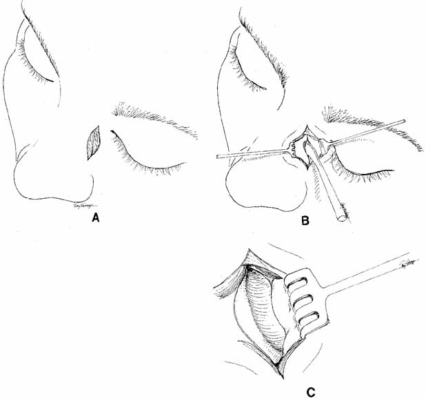 POSTOPERATIVE CARE. Unless there are extenuating circumstances, DCRs are usually done as an outpatient surgical procedure. If Silastic tubing has been used as a stent, the postoperative course is more pleasant. There is minimal edema with the DCR technique described above, regardless of the stent used. The small pressure dressing usually is left in place only until the next morning. In a pediatric patient, the dressing can be removed as soon as the child awakens from anesthesia. Antibiotic ointment or drops usually are applied to the conjunctival cul-de-sac at bedtime only during the first week postoperatively. Patients with nasal packing or a fixed catheter, which applies to those patients without a stent, need to have the packing or catheter removed 5 to 7 days after surgery. Again, the use of these materials can increase the risk of infection or result in bleeding when removed. Thus it is less common for these to be currently used and are discussed only for completeness. Finally, appropriate systemic antibiotic, such as a first-generation cephalosporin can be given intravenously during the procedure and continued orally for 3 to 5 days postoperatively. However, some believe that one or the other is adequate and that both intraoperative antibiotics and postoperative antibiotics are not necessary.84–87 The Silastic tubing can be left in place for long periods in the adult as it is so well tolerated. The stent is typically removed 6 to 12 weeks postoperatively if there are no associated canalicular or common internal punctal problems noted at the time of surgery. The nylon subcuticular suture can be removed 5 to 7 days postoperatively. Although granulomas at the ostium have been noted after DCR with Silastic tubes, many patients who are free of symptoms are reluctant to have the tubing removed. We have seen adult patients retain Silastic tubing without any problems for as long as 10 years. Endoscopic Dacryocystorhinostomy Endoscopic DCR has become popular over the last decade because minimally invasive surgical techniques have come into vogue. As early as 1893, the internal approach to DCR was described,88 and subsequently it was developed to approach success rates similar to those for the external approach to DCR. However, the internal approach was not commonly in use until the development of the endonasal laser DCR in 1990,89 utilizing an internal DCR technique with the use of fiber-optic and laser technology. An argon blue–green laser is coupled to a fiberoptic laser catheter and used endoscopically to remove nasal mucosa and bone. The reported advantages of endoscopic laser surgery include decreased tissue damage, absence of cutaneous scar, excellent hemostasis, and decreased perioperative morbidity. More recently, endoscopic DCR utilizing functional endoscopic sinus equipment has increased the popularity and success rate of the endoscpopic approach. A variety of techniques are described in the literature.90–96 These range from endonasal drilling and trephination, to the use of a ronguer and/or adjunctive use of mitomycin C. One approach is the following: the nasal mucosa is anesthetized with 4% cocaine and local 1% lidocaine with epinephrine injection into the nasal mucosa just anterior to the middle turbinate. The mucosa in this area is incised with a sickle knife and removed with front biting cutting endoscopic instruments. Once the bone is exposed, a burr is used to remove the wall separating the nasal cavity form the lacrimal sac. With the sac exposed it is incised vertically and exposed. The system is then stented with bicanalicular Silastic stents and secured in place (Fig 47A, 47B, and 47C). This technique is efficient with minimal morbidity and no external scar. However, because the lacrimal sac is not sewn to the nasal mucosa, the ultimate size of the fistula reduces to that of the Silastic tubing diameter. Some individuals have tried treating the fistula site with topical mitomycin C to prevent the fistula opening from shrinking with varied results. Overall, in experienced hands the endoscopic approaches are efficient and effective with success rates well in the 90% range similar to external DCR. Attempts to streamline the technique have included utilizing a vitrectomy fiber-optic light pipe to assist with surgery. The light pipe is fed into the canaliculus and into the lacrimal sac. The light then visualizes where a small mucosal incision is made and the bone can be removed under direct visualization with ronguers followed by stenting. 97 The most recent technique described by Dolman87 involves placing a large Bowman probe into the lacrimal sac and simply puncturing through into the nasal cavity. After the probe is identified in the nasal cavity, the opening is expanded under direct visualization with a ronguer and stented. This proves to be quick, efficient, and as effective as standard DCR surgery. Finally, a new large 9-mm balloon catheter was recently introduced as an additional alternative. In this instance multiple passes are made with a large Bowman probe to create a Swiss cheese-like pattern in the bone between the lacrimal sac and the nasal cavity. The balloon is fed into the lacrimal sac in retrograde fashion, straddling the bone and inflated. The authord have no experience with this technique. With these advantages, many still consider the external approach the gold standard. The success of the traditional external approach and its low morbidity are well documented. Yet with the improved technology of the last 10 years along with exposure to endonasal surgery and experience, the endoscopic approach is a viable alternative, especially to the patient who does not wish to have an external scar. In fact, in experienced hands, the endoscopic success rates are approaching that of the traditional approach. Dacryocystorhinostomy Revision Previously, many methods to revise a failed DCR have been described.62–64,98–100 These include dilation with a lacrimal pro
