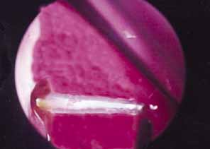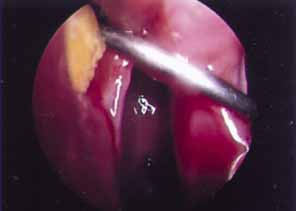 The endoscopic approach is useful in patients who need revision of DCR. The nasal ostium is easily identified and work is accomplished in a retrograde fashion. The ostium can easily be expanded with functional endoscopic sinus surgery instruments or a rongeur. Debris obstructing the fistula can also be identified and removed (Fig. 49).