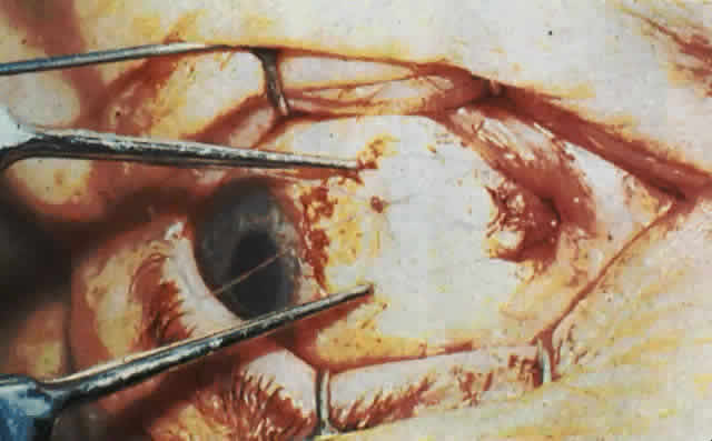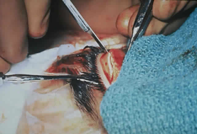 The upper and lower lids are anesthetized with 2% Xylocaine with epinephrine. A 4-0 silk suture is placed through the upper lid margin and centered over the pupil; the lid is everted over a Desmarres retractor. The conjunctival surface of the upper lid tarsus is dried with a cotton-tipped applicator. The elliptic area of excision, 20 mm wide and 5 to 7 mm high, is outlined, leaving a margin of 1 mm along the superior margin and 2 mm along the inferior margin. The tarsus is incised with an Alcon 30° blade or a ï15 Bard Parker blade along this outline. The tarsus is then dissected free from the underlying orbicularis muscle with Westcott scissors (Fig. 8). Hemostasis is maintained by use of cautery. The donor tarsal tissue is wrapped in gauze soaked in saline. The upper lid is returned to its normal anatomic position and the silk suture removed.
