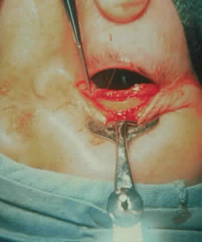 UPPER LIDS The most common upper lid disorder requiring surgical therapy is upper lid retraction. Upper lid retraction may cause dry-eye symptoms and exposure keratitis and may even allow for a corneal ulcer due to inadequate lid closure. It also contributes significantly to cosmetic disfigurement. Preoperative evaluation of a patient with lid retraction should include measurement of the lid height, measurement of the distance between the superior limbus and the upper lid margin, examination of the cornea for evidence of exposure keratopathy, and preoperative photographs for documentation. Surgery for isolated lid retraction is usually performed after 1 year of observation because of the tendency for spontaneous improvement. Lid retraction surgery is otherwise performed after decompressive and strabismus surgeries have been completed and the lid position has been stable for 6 months or more. A variety of methods for treating upper lid retraction have been described. These include recession of the levator aponeurosis with or without insertion of a spacer, disinsertion of the levator aponeurosis, recession of Müller's muscle, and excision of Müller's muscle.3,4 The method that we usually employ is a transconjunctival approach to a müllerectomy for 1 to 2 mm of retraction (Fig. 3) together with a graded levator aponeurosis myotomy for 2 to 3 mm of retraction (Fig. 4). A levator recession is performed for patients with over 3 mm of upper lid retraction. This approach allows us to tailor the amount of surgery performed to the severity of the upper eyelid retraction.