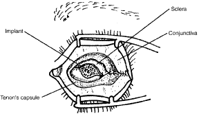 INDICATIONS FOR EVISCERATION Evisceration is the removal of the ocular contents while leaving the sclera and optic nerve and, in some cases, the cornea intact. Evisceration offers several advantages over enucleation. Operating time is shorter, the operation is less technically challenging, and the procedure can be performed under retrobulbar anesthesia. There is less disruption to the orbital tissues, better motility, and a more cosmetically acceptable orbit when compared with enucleation. It is the preferred treatment for endophthalmitis because it allows for extirpation and drainage of the ocular contents without orbital invasion. In cases of endophthalmitis, orbital implantation has typically taken place as a secondary procedure. However, a recent study has found that primary implant placement is a viable technique.20 Disadvantages include the theoretical risk of sympathetic ophthalmia and a less complete specimen for pathologic examination to detect intraocular malignancy or spread. Although controversy exists as to the exact indications for evisceration and enucleation, evisceration should never be performed in cases of suspected intraocular tumor. THE EVISCERATION PROCEDURE The appropriate eye for removal must be established as described previously. Unlike enucleation, evisceration can be performed using a retrobulbar injection and intravenous sedation. Whether monitored anesthesia or general anesthesia is used, a retrobulbar injection of 3 cc of a 50/50 mixture of 1% lidocaine and 0.5% bupivacaine with 1:100,000 units of epinephrine is injected to control oozing and provide postoperative pain control. The patient is then prepped and draped by the surgeon. An eyelid speculum is placed and a 360-degree limbal peritomy is performed with blunt-tipped Westcott scissors and small toothed forceps. Using Steven's scissors, the four quadrants between the recti muscles are cleared. This is performed by grasping the edge of conjunctiva and Tenon's capsule, advancing the scissors posteriorly along the sclera to just past the equator and spreading the tissue by opening the scissors. Approximately 1 to 2 mm posterior to the limbus, a small full-thickness scleral incision is made. Westcott scissors are then used to make a circumferential incision around the globe to remove the cornea. If the cornea is to be left in place, the incision is stopped just short of completion leaving a small scleral hinge. The intraocular contents are then separated from the sclera using an evisceration spoon or Freer periosteal elevator. Bleeding from the optic nerve or penetrating vessels can be controlled with gentle bipolar cautery. The pigment is meticulously removed using absolute alcohol on a cotton-tipped applicator. The scleral cavity is then copiously irrigated with antibiotic solution. Windows oriented in an anterior to posterior direction are cut in the sclera in the four quadrants between the recti muscles using scissors. The sclera can also be opened around the optic nerve.21 These scleral windows allow for vascular ingrowth if a porous implant is placed. Scissors are then used to make two cuts at the anterior opening of the sclera in an inferior-medial and superior-lateral direction to facilitate implant placement into the sclera. A sphere implant measuring from 14 to 18 mm is placed into the scleral cavity (Fig. 9). Redundant sclera is trimmed and the sclera is closed with multiple interrupted 5-0 Mersiline sutures. Tenon's capsule is closed first with multiple interrupted 5-0 Vicryl sutures. The conjunctiva is then closed with a running suture of 7-0 Vicryl (Fig. 10). Antibiotic ointment and a conformer are then placed between the eyelids, and the socket is pressure patched for 4 to 7 days. Some surgeons place patients on prophylactic oral antibiotics for the first few days following surgery. After the patch is removed, the patient is asked to apply antibiotic ointment to the socket twice a day for the next 2 to 4 weeks. Continued wear of the conformer is essential to prevent shortening of the conjunctival fornices. The patient is ready to see the ocularist 6 to 8 weeks after surgery for the prosthesis fitting. As with any monocular patient, polycarbonate glasses should be worn routinely to protect the remaining eye.