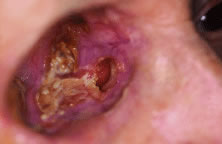 Immediate postoperative complications following standard exenteration surgery are uncommon and are best avoided with meticulous surgical technique. Complications include hemorrhage, cerebrospinal fluid leak, osteomyelitis, and intracranial infection. Any postexenteration patient with altered mental status must be evaluated for an intracranial infection. ORBITAL RECONSTRUCTION After the resection is complete, the options for reconstruction of the orbit must be assessed and individualized for each patient. Following craniofacial resection, the use of distant microsurgically attached, free myocutaneous flaps are typically required for closure and protection of vital structures. Primary flap reconstruction also allows for early postoperative radiation therapy. Following a standard exenteration in which the orbital bones are left intact, immediate reconstructive options include granulation, split-thickness skin grafts, or regional flaps. Granulation of the socket is the simplest reconstructive technique. It is complete approximately 2 months following surgery. Granulation produces a thin skin covering of the orbit, which allows easy inspection and identification of tumor recurrence. Following resection, the orbit is irrigated and packed with iodine-dampened gauze and patched for 1 week. After removal of the patch, the gauze is removed daily and the socket is cleaned with hydrogen peroxide or soapy water. After granulation is complete, the patient may elect to wear a patch or silicone orbital prosthesis. A split-thickness skin graft can also be placed in the exenterated socket. The skin graft is commonly harvested from the thigh with a dermatome with a thickness of 0.015 to 0.017 inches. The graft is then placed in the socket and sewn to the skin edges with absorbable sutures. The skin graft is then covered with an antibiotic ointment and the socket is packed with iodine-soaked gauze for 1 to 2 weeks. Advantages of the split-thickness skin graft method include rapid healing and a thin orbital covering. Disadvantages include pain at the graft donor site and hyperkeratosis of the socket requiring occasional debridement. A drawback of both granulation and split-thickness skin grafting is the relatively high occurrence of fistula formation between the orbit and adjacent sinus or nasal cavities (Fig. 26). The incidence of fistula formation following granulation ranges from 35% to 68%.40,42