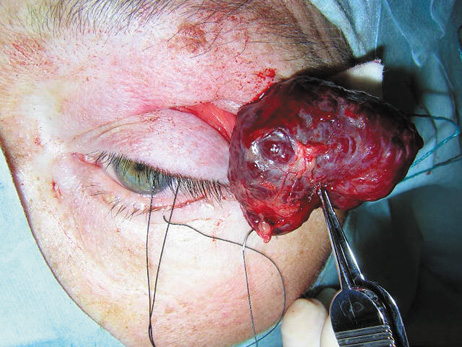 by medical management or radiation therapy. An incisional biopsy is performed when a representative piece of tissue is removed but some of the lesion is left behind. This type of biopsy is used to confirm a clinical diagnosis before proceeding with medical therapy or radiation therapy (e.g., lymphoma, orbital pseudotumor, rhabdomyosarcoma). It also may be used to obtain a tissue diagnosis before planning a definitive surgical treatment such as exenteration or extensive orbitocranial resection (e.g., malignant lacrimal gland tumors). In some cases, incisional biopsy provides a tissue diagnosis and also is used to debulk a tumor. Diffuse infiltrative orbital lesions usually require incisional biopsy to confirm the diagnosis before other therapy can begin. An excisional biopsy is performed when an orbital mass is removed in its entirety. Excisional biopsy is performed on lesions that are believed to be benign, well localized, and easy to remove without damage to surrounding orbital tissues. As a general rule, well-circumscribed and encapsulated lesions are treated with excisional biopsy. This is especially important in cases of benign mixed tumors of the lacrimal gland or orbital dermoid cysts where incision through an intact capsule dramatically increases the chance of recurrence and orbital morbidity. In general, malignant lesions of the orbit are not amenable to excisional biopsies, because tumor-free microscopic margins cannot be obtained in orbital fat. |