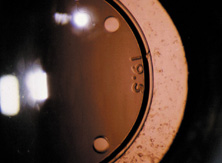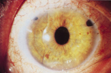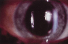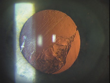 “Pits” on the optical component of the IOL are another common complication of Nd:YAG laser capsulotomy. This is usually the result of a close relation between the posterior capsule and the posterior optic surface of the IOL, or problem with focusing of the laser. These “pits” usually have no influence on the patients' visual acuity, and exchange of the damaged IOL is rarely required. INTRINSIC INTRAOCULAR LENS PROBLEMS Sterility We take for granted the sterility of the delivered packaged product. Each outside box and inside sterile package should be free of defect. If the box appears to be damaged or if the internal package is suspect, the IOL should not be used. Haptic Defects Haptics may be deformed or their angulation with respect to the optic may be disturbed during the manufacture and packaging process. A careful inspection before implantation usually reveals any significant defect. Optic Defects It is highly unusual to find an optic defect before implantation, but a brief inspection is good. No fluid should be placed on the IOL before inspection, because defects will not be seen. It is so unusual to find a defect that inspection by a properly trained technician or nurse loading the IOL injector is acceptable. Optic Discoloration Some earlier plate haptic lenses manufactured by both STAAR Surgical and AMO have been noted to become evenly brown with time.230–233 This color change has not been associated with decreased vision. It is less common with the latest formulation of silicone, RMX 3, which STAAR is currently using. Extremely rare cases of minimal browning of the central two-thirds thickness and 4.0 mm diameters of Alcon SA60AT and SN60WF optics has also been observed (Fig. 90) (JAD unpublished observations). The silicone optics manufactured by AMO more commonly appears blue when seen at the slit lamp. These color changes are intrinsic and not progressive, and do not normally interfere with visual performance. The exception to that rule is the extremely rare patient who has one eye implanted with a light-normalizing IOL (Alcon Surgical SN60WF) and the other with an AMO S140. Differences in color perception can become apparent with the perception through the AMO eye appearing “bright and white” and the Alcon eye appearing “flesh toned.” Acrylic Glistenings The appearance of glistenings60 caused the acrylic lens to be temporarily withdrawn from the U.S. market shortly after its introduction in 1995. These translucencies accumulated in the optic over the first few months of implantation but subsequently were found to be nonprogressive (Fig. 91). They were actually found to be water vacuoles drawn in from the aqueous. They were associated with another plastic in the presterilized packing material,234 and they decreased markedly when the packaging was changed. Manufacturing process has improved so that the amount of glistenings has been dramatically reduced to trace amounts but can still be seen in a fair number of patients. They are more prominent in eyes with blood-aqueous barrier abnormalities like diabetes. Interestingly, these are just the eyes that benefit the most from the biocompatibility of the acrylic material. Glistenings can also occur in silicone IOLs, although they are much less obvious.