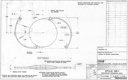 Ridley had been inspired by the tolerance of British fighter pilots' eyes to plastic fragments, which had lodged in them after their canopies, made of polymethylmethacrylate (PMMA; Perspex), had shattered. He worked with the Rayner Company and Imperial Chemical Industries, both in Great Britain, to develop Perspex CQ, a more purified “clinical-quality” PMMA. He used the human lens as his model and selected similar radii of curvature to create a biconvex disc while using approximately half the thickness and weight (∼5 mm thick and 230 mg for the human lens). One of his original lenses made by Rayner, a 23.00 diopter (D), was measured at 8.5 mm in diameter and 2.4 mm thick, with a weight of 108 g. Modern analysis has demonstrated that this IOL passes modern optical bench examinations10 (Fig. 2).