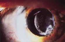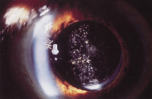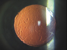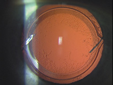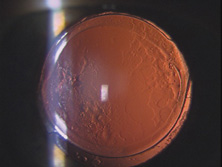 The glistenings may be uniform or appear to be denser in one part of the optic than another. They rarely have been associated with reduced vision and explantation. ”Snowflake” Alteration of Polymethylmethacrylate Intraocular Lens Optic Beginning with a gradual accumulation of anecdotal reports in the mid-1990s, opacifications of PMMA lenses that had developed in the late postoperative period started to appear.235 All IOLs were three-piece designs with PMMA optics and blue polypropylene or PMMA haptics. The majority were Ioptex and Surgidev models. All were implanted between the early 1980s to the mid-1990s. In some cases the implant duration was 10 years or more. Although the Surgidev IOL cases were not progressive, most of the others, especially the Ioptex models, caused a gradual but progressive decrease in vision as the lesions increased in volume and intensity. Most examiners described the white-brown opacities within the IOL optics as “crystalline deposits.” In addition to visual loss, the reported symptoms included decrease in contrast sensitivity and various visual disturbances and aberrations, including glare. A correlation of the clinical, gross, light, and electron microscopic profiles of all cases showed a distinct pattern and revealed almost identical findings, differing only in the degree of intensity of the snowflake lesions. The recurrent and interconnecting finding in all cases was the presence of the roughly spherical snowflake lesion, which was interpreted as foci of degenerated PMMA biomaterial. It was suggested that manufacturing variations in some lenses fabricated in the 1980s and early 1990s may be responsible. It is possible that the late change in the PMMA material process is facilitated by long-term UV (solar) exposure. Potential causes of a snowflake lesion include (a) insufficient post-annealing of the cured PMMA polymer; (b) excessive thermal energy during the curing process leaving voids in the polymer matrix; (c) nonhomogeneous distribution of the UV chromophore and/or thermal initiator into the polymer chain; and (d) poor filtration of the precured monomeric components (MMA, UV blocker, thermal initiator). Another possible pathogenic factor could be an inadvertent use of excessive initiator substance during the polymerization process that may be disrupted by gradual UV exposure with a release of nitrogen gas (N2) and that may facilitate the formation of the snowflake lesions.236 Optic Calcification Several hydrophilic acrylic IOLs have presented with opacification on the surface or within the IOL optic (Fig. 34). This opacification can be divided into the following: