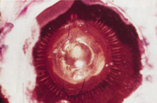 Ridley said that the cataract operation “without a replacement lens was an incomplete, only half finished operation”11 and that he would like to be remembered as the man who cured or at least initiated the cure for aphakia. He saw aphakic vision as a highly significant but unnecessary disability. Now only a memory, at least in the modern world, aphakic vision contained many disturbing visual side effects. The roving scotoma, Jack-in-the-box phenomenon, 30% magnification, distortion, loss of side vision, and extreme spectacle dependence were disabling for many patients. Because of this, even as late as the mid-1970s, surgery was typically performed only when the patient's vision decreased to 20/70 or worse in the better eye, with that eye undergoing operation 3 days after the first eye. In recognition of his pioneering efforts in IOL development and implantation, Mr. Ridley was knighted on February 19, 2000, by Queen Elizabeth II, 50 years after his first implantation. Warren Reese was the first American surgeon to perform the first IOL surgery in the United States at the Wills Eye Hospital, Philadelphia, in 1952. Mr. Ridley himself performed the first operation in America and gave the lenses to him after delivering a lecture at the Chicago Ophthalmological Society. Despite that early beginning, it would take more than 25 years for IOL implantation to become the dominant and standard accepted method of curing aphakia in the United States. The Ridley lens was placed in the posterior chamber after ECCE (Fig. 3). The anterior capsulectomy of the day was very large, and thus zonular support was poor. Some Ridley lenses dislocated into the vitreous because of poor zonular support, and partially because of their weight, which was approximately eight times that of current IOLs.