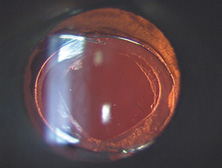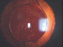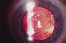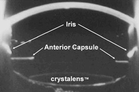 Rotation of Toric Plate Haptic Silicone Intraocular Lens Plate haptic toric IOLs produced by STAAR Surgical are 11.2 mm long for powers of 22.00 D and lower. The remainder are 10.8 mm long. The day after surgery, 90% of plate haptic toric IOLs are in good position relative to the axis marked with the patient upright before surgery. Up to 10% of them have rotated enough so that their power may be affected. Only rotations of 20 degrees or more are repositioned, usually 1 week after surgery to allow some capsular reaction to take place, reducing the risk of rerotation. A 10-degree rotation reduces effective astigmatic correction by 25%, and, in a worst-case scenario, a 90-degree rotation increases astigmatism. To achieve appropriate correction, these IOLs need to have their position adjusted. Rotation may be lessened by the newer 10.8-mm diameter (up from 10.5 mm). They are available in 2.00 D and 3.50 D models, which can correct approximately 1.50 D and 2.50 D of refractive cylinder. Alcon's single-piece toric model has been shown to exhibit very little rotation.221 (Fig. 84). Pupillary Capture After normal intraocular pressure is obtained, most clear corneal incisions will eventually show signs of leakage at surgery, if they are observed long enough. A very rare patient may experience an incision leak in the hours or days after surgery significant enough to shallow the AC. This may be the result of incision imperfection or a blow to the eye. If the pupil is still dilated, it will be possible to capture the optic partially or completely. Pupillary capture implies anterior capsulorrhexis capture. Also, it would be impossible to capture the optic by the pupil unless it had escaped the capsular bag. Patients with plate haptic lenses, regardless of the status of the incision or AC depth, will have to return to sterile conditions to have their IOLs placed back within the capsular bag. For patients with C-loop haptics, if the incision is still seen to be leaking with accompanying low intraocular pressure and shallow chamber, a return to sterile conditions will be required so that the incision can be closed and the IOL repositioned. In patients in whom the incision is no longer leaking, with normal IOP and a normal depth AC, pupillary dilation and then constriction after the IOL has fallen posterior may allow appropriate pharmacologic repositioning. The IOL will still be captured within the capsulorrhexis opening, but that should be of little consequence. Substantial changes to the iris and capsular bag architecture may occur if pupillary capture goes unnoticed for some time (Fig. 85). It is important to check the IOP and examine with the indirect ophthalmoscope because a shallow chamber may be produced by choroidal effusion or suprachoroidal hemorrhage immediately after surgery. Anterior Position of Crystalens™ Atropine is given after surgery to make sure that the optic is flexed posteriorly against the posterior capsule. An anterior position, which would change functional IOL power and pseudoaccommodative performance, could occur with postoperative wound leakage and chamber shallowing. Because of this, Dr. Cumming recommends the use of a scleral tunnel incision with the Crystalens™. He also recommends the SRK/T formula for axial lengths of 22.0 mm or longer and the Holladay II formula for shorter eyes.156 Capsular Bag Distention/Capsular Block Syndrome Capsular bag distention syndrome may have several different causes. Usually seen several days to weeks after surgery, it is characterized by a distended capsular bag with the IOL optic pushed forward slightly, usually creating a low-grade myopia (Fig. 86). It has been thought that trapped viscoelastic material could trigger this phenomenon. Micropipette studies have demonstrated residual viscoelastic within the capsular bag.222 Protein production by residual epithelial cells has also been mentioned as a possible cause. Distention can be created during the final intraocular pressure adjustment and stromal hydration incision sealing procedure. Finally, a bench test model experiment has demonstrated that fluid from the AC can be pushed back behind the IOL into the intracapsular space by saccadic eye movements.223 Treatment can be accomplished with a single 1.6-mJ shot from the YAG laser, making a small opening in the peripheral anterior capsule that allows egress of the trapped fluid. Pigment Dispersion and Uveitis, Glaucoma, Hyphema Syndrome This was a more common problem in the days of ciliary sulcus placement and asymmetric placement. It could occur with both posterior and AC IOLs.220,224 It can still be observed in capsular bag placement especially in cases of zonular laxity (e.g., pseudoexfoliation). In these cases, there can be substantial iridopseudophakodonesis, which may lead to transillumination defects in the shape of the haptics (Fig. 87). Deposition of pigment occurs in the angle over the trabecular meshwork and may be associated with increased intraocular pressure. Observation of pressure and optic nerve head anatomy should be conducted regularly because the outflow channels in patients with pseudoexfoliation may have been compromised previously. Because of the iridophakodonesis, intermittent bleeding and episodes of uveitis may also be noted independent of increased pressure, and IOL exchange may be necessary. There are several reports of such complication after implantation of both single- and three-piece Acrysof® IOLs into the ciliary sulcus.225,226 The AMO Sensar with a rounded anterior edge should be better for sulcus implantation of acrylic IOLs. Post-Nd:YAG Dislocation Nd:YAG laser capsulotomy has been performed in X, cross, triangular, and circular patterns. When using one of the linear patterns, the posterior capsular opening could extend to the capsular bag equator. Because plate haptic silicone IOLs are weakly held in place by capsular fibrosis, some of these were found to dislocate into the vitreous cavity after Nd:YAG