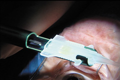 Inevitably, with the new technique of capsulorrhexis, the improved haptic architecture was actually not as critical as it had been earlier, when ARTs were universal. It was still helpful in difficult situations in which capsular support was anomalous (e.g., pseudoexfoliation and trauma). Coatings of heparin and Teflon were developed to increase the biocompatibility of PMMA IOLs.50 However, the benefits of the sophisticated one-piece PMMA capsular bag design would soon be replaced by the even greater benefits of foldable IOLs, the use of which would overtake PMMA in 1998.46 Sutured superior corneoscleral incisions with round PMMA IOLs were standard throughout the 1980s, until the self-sealing incision was described by Mike McFarland in 1991.51 In an attempt to integrate the smaller phacoemulsification incision and PMMA technology, ovoid posterior chamber IOLs had been produced since 1980 and reached their peak in popularity (35%) in 1991 (Fig. 24).46 But, because of their truncated edge, ovoid IOLs introduced a higher incidence of glare, streaks, and halos52 (pseudophakic dysphotopsia); for this reason, they never reached great popularity. Attempting to reduce edge glare and still maintain optic truncation, Charles Kelman created the PhacoFlex IOL. Two side portions of the optic had opaque silicone wings, which would fold on top of the PMMA central optic during insertion through a 3.5-mm incision, and then unfold in the eye. Many years later, Howard Fine would recommend using such a textured finish in plate haptic silicone IOL haptics, not for optical reasons, but to enhance capsular fixation to prevent IOL movement within the capsular bag. FOLDABLE LENSES, CLEAR CORNEAL INCISIONS, AND TOPICAL-INTRACAMERAL ANESTHESIA In 1984, Mazzocco et al introduced the first foldable plate haptic silicone lens produced by STAAR Surgical.53 It became known as the “Mazzocco Taco” because of the way it appeared when folded. It was delivered through an injector, whose cartridge went through a 3-mm incision allowing the IOL to unfold in the posterior chamber (Fig. 25). This changed cataract surgery forever because it made possible the full appreciation of phacoemulsification. Cataract surgery had become the first microscope-accomplished, machine-assisted “small-incision surgery” in medicine. All of the benefits of improved surgery safety, improved postoperative state quality, and shorter patient recovery were realized.