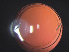 This lens design revolutionized the concept of IOL placement, but the need for a supportive capsular bag architecture was not fully appreciated, nor had the techniques to preserve it been developed. Most dislocations were incomplete (i.e., nonintravitreal). For example, the sunset syndrome (Fig. 10) resulted from occult anterior radial capsular tears (ARTs), which extended through the equator or inferior zonular disruptions and allowed the inferior haptic to sink through the defect. However, in most inferior dislocations, the IOL optic was still contained within the ciliary sulcus. The IOL's overall length was too short for symmetric sulcus fixation, so the whole IOL structure gravitated inferiorly with sulcus placement. The “windshield wiper syndrome” resulted from sulcus contact inferiorly but none superiorly. Surgeons tried to retain at least a leaflet of anterior capsule inferiorly in which to place the inferior haptic. When that was accomplished, the IOL stayed fairly well centered. However, if asymmetric placement occurred with the inferior haptic contained within the capsular bag remnant and the superior haptic loose in the ciliary sulcus, there would be opportunity for another type of decentration, the sunrise syndrome.