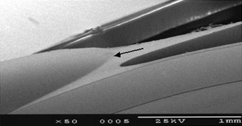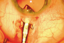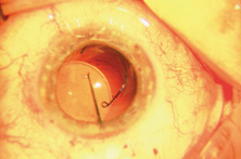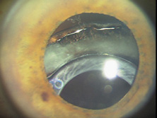 Optic Damage PMMA optics may be scratched, silicone optics torn, and acrylic optics slightly cracked during implantation. Care in handling the optic is key. Proper loading of injectors is important, but even if well done by experienced doctors, technicians, and nurses, tears in delicate silicone are possible. Acrylic lenses should be folded slowly and carefully at approximately room or body temperature. It is possible to damage the central acrylic optic if folded too sharply for too long.216 Damage can also occur in silicone optics during the unfolding process.217 Of course, all instruments should be cleaned and polished free of debris before optic contact, or debris may be imprinted onto the optic. The Monarch injector by Alcon gently curls the acrylic optic, avoiding the acute folding required by instruments. The chance for optic trauma is higher if the lens is tightly rolled in the distal cartridge for a longer time.61 Optic torque has been found to be less if a dispersive viscoelastic such as Viscoat was used during the injection process.218 In general, if defects are small and peripheral, they may be tolerated: The risk of exchange is greater than the risk of leaving them in place. If the tears are substantial and may affect vision or structural performance, the IOLs need to be exchanged. PMMA lenses can simply be removed as they were implanted. Silicone lenses may be divided with scissors and removed (Fig. 78), whereas acrylic IOLs may be refolded within the eye and then removed from the original incision (Fig. 79).57