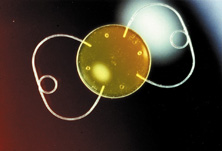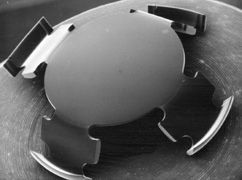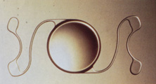 RETURN TO POSTERIOR CHAMBER LENSES John Pearce of the United Kingdom returned implantation to the posterior chamber by developing a rigid tripod-shaped PMMA IOL designed for implantation there,17 but it was Steve Shearing who would have the greatest influence on the future development posterior chamber IOLs. In March 1977, he introduced his IOL, which featured flexible posterior haptics (Fig. 9).18 His original intention was to have the haptics placed within the capsular bag remnant. The lens had a 5-mm optic (because that was the size of the Binkhorst optic, which was already in production at the time) and an overall length of 12 mm and was flat.