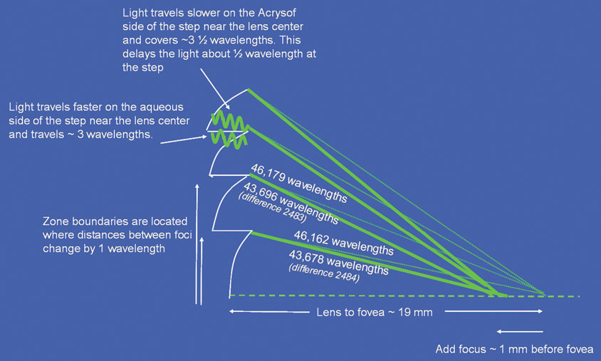 With most of the lenses, the onset of the opacification occurred from 6 months to years past the operation; the lens opacifications have occurred in only a handful of lenses. This has, unfortunately, at present served to give this material a poor reputation. Virtually all problems seen were based on faulty manufacturing, either at the time of formation of each company's polymer or during fabrication and packaging of the lens. For example, a hydrophilic acrylic material manufactured by Rayner Corporation has been implanted in approximately 1 million cases in 5 years with no report of primary calcification (data in file at Rayner Corporation). Pseudophakic Dysphotopsia The potential for flare, streaks, halos, shadows, and other abnormal visual perceptions239 in the pseudophakic patient (termed pseudophakic dysphotopsia (Olson RJ: IOL exchange to correct severe glare in 5.5 mm AcrySof patients. Presented at the Symposium on Cataract, IOL and Refractive Surgery, San Diego, CA, April 1998) have been present in every IOL design since Ridley's first implantation in 1949. The phenomenon is increased in incidence and severity by the use of small-diameter optics or truncated ovoid optics.60,240–245 Pseudophakic dysphotopsia is underdiagnosed because many patients will tolerate mild to moderate symptoms without ever saying much of anything about them. Other patients are more persistent in their willingness to articulate their experiences, which makes it easier to diagnose pseudophakic dysphotopsia. Some patients feel absolutely possessed by their visual distractions and find them virtually unbearable. If asked about them in a specific questionnaire, 20% of pseudophakic patients will report some type of abnormally imaged side effect.240 Although sometimes severe, these symptoms have usually been transient and clinically insignificant. However, these abnormal secondary perceptions attained contemporary interest because of their apparent increased incidence and severity in the very popular AcrySof® IOL.134,221,246–263This continues to be a reason for IOL exchange in a small but significant number of patients with this lens design and in patients implanted with similar designs as well. The dysphotopsia can be divided into “positive,” bright spots and streaks (Fig. 93),240 and “negative,” straight or slightly curved temporal dark shadows that appeared to be dark to the patient (Fig. 94).260 The combination of high refractive index hydrophobic acrylic material, square edge, and relatively flat anterior surface is especially prone to this complication. The square edge, which is a key feature in reducing central epithelial proliferation and resultant PCO, has been incriminated in a ray tracing analysis study. The internal reflection from the IOL edge diverts light rays to the opposite retinal field, casting a shadow where they otherwise would have struck the retina (Figs. 95 and 96).134 Other ray-tracing studies found that the relatively flat anterior surface of the high index refraction IOL may contribute to dysphotopsia.251,258An external light source at approximately 1 to 25 degrees to the optical axis can result in an internal surface reflection that is round or oval in shape and occurs with pupil sizes as small as 3.2 mm (Fig. 97). Alcon engineers responded with three key design modifications that were ultimately introduced in its single-piece models and later in its MA30AT and MA60AT three-piece models to improve optical performance. First, the power curves of the optics were reversed so that the relatively flat 5.5 D, which had defined the anterior surface, was placed on the posterior surface with the relatively more round dioptric power curve on the anterior surface. Second, the edge was modified in a proprietary process so that it was rendered antireflective (Fig. 98). And third, the edge was thinned to 0.22 mm from its immediately preceding 0.3 mm on the MA30AL and MA60AL (it was 0.4 mm thick at its introduction on the MA60AL) (personal communication, Alcon Surgical, November 2002).