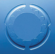 Synchrony™ Lens This IOL was implanted in more than 100 human eyes outside of the United States. Clinical trials in the United States will begin during 2005. The Synchrony™ IOL (Visiogen Inc., Irvine, CA) is a one-piece lens manufactured from silicone (Fig. 58). The lens is a dual-optic design composed of two optical components, a plus-powered lens anterior, and a minus-powered lens posterior. These are connected by a spring-like haptic structure. The posterior aspect of the device is designed with a significantly larger surface area than the anterior, to maintain stability within the capsular bag during the accommodation/un-accommodation process. The anterior optic has two expansions oriented parallel to the haptic component that lift the capsulorrhexis edge up, thereby preventing a complete contact of the anterior capsule with the anterior surface of the lens. The lens is designed to work in concert within the capsular bag, according to the traditional Helmholtz theory of accommodation. In the nonaccommodative state, the tension of the capsular bag and zonule keeps the two optics close to each other. With accommodation, the ciliary muscle contracts, the zonule relaxes, and the capsular bag expands with the springs pushing the two optics away from each other. The first Miyake-Apple analyses demonstrated that this lens could be implanted without distortion/ovalization of the capsulorrhexis opening and the capsular bag. Also, significantly less ACO and PCO were observed in rabbit eyes after implantation of the Synchrony™ lens in comparison with plate haptic silicone lenses. A total of 100 lenses have been implanted as of the end of 2004 in non-U.S. clinical studies. Sarfarazi Lens This IOL is undergoing laboratory study. Another dual-optic, accommodating IOL system was invented by Dr. Faezeh M. Sarfarazi, and it is now being developed by Bausch and Lomb (Rochester, NY). This is a single-piece molded silicone lens, with two optics connected by three haptic components. Preliminary experimental results with the latest version of this design are not yet available. This lens, with any dual optic system, has the possibility of an interlenticular opacification (IOL). This is because of an ingrowth of residual/retained equatorial epithelial cells into the space between the lens. The best means to prevent this is to achieve an excellent cortical clean-up. SmartIOL™ This IOL (Medennium Inc. Irvine, CA) fills the capsular bag and may have the ability to provide accommodation as well (see “Pseudophakic Intraocular Lenses for Very Small Incisions”). ANIRIDIA INTRAOCULAR LENSES: 2004 Aniridia IOLs are available in Europe, but they are only available in the United States on a compassionate use request to the FDA. Morcher GmbH also manufactures posterior chamber aniridia IOLs from black PMMA. These are available in various forms, sizes, and dioptric powers, and are best used if they can be secured within the capsular bag or its remnants or when suturing of the lens is required (Fig. 59).
