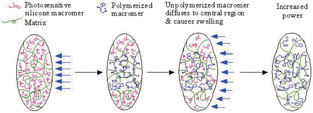 The ultrathin properties of the lens are attributable to its optical design. The optic features three to five concentric optical zones with steps of 50 μm. Each Fresnel-like ring or segment of the lens has a small change in the radius to correct for spherical aberration. The difference in radius is stated to ensure that each ring of the lens focuses light at nearly the same point as the prime meridian. According to the manufacturer, by making the lens thinner, other aberrations such as coma and the potential for distortion and glare are reduced. The four tips of the haptic component are very thin, measuring only 50 μm. They can roll once in the capsular bag, absorbing capsular contraction forces. The edge of the lens is also 50 μm thick, which is stated to reduce the potential for halos and glare. In the first clinical studies involving this lens design, many of the patients presented with better than expected near vision. It has been hypothesized that the thin nature of this design provides increased amplitude of pseudoaccommodation, which will be further investigated. One explanation could be that the thin lens is associated with increased depth of field. Another possibility is that the lens would move with the capsular bag during efforts for accommodation, because it is thin and light, and exerts little force against the equator. At first the UltraChoice™, also called the ThinLens, was folded manually. As of 2004, a roller/injector system with an autoclavable, reusable cartridge made of Teflon is available. Cadaver eye studies conducted in Dr. Apple's laboratory demonstrated excellent centration of the UltraChoice™ ThinLens IOL. Acri.Smart™ Another recently developed lens for insertion through very small incisions is the Acri.Smart™ lens (Acri.Tec GmbH, Berlin, Germany). This is a one-piece, plate, planar lens with an optical diameter of 5.5 mm and a total length of 11.0 mm (model 48S). The first Acri.Smart™ lens was rolled onto itself to create a prefolded lens that was shorter in diameter. A folded +19 D lens had a width of approximately 1.2 to 1.3 mm. During the minutes after implantation in the capsular bag, the Acri.Smart™ unfolded gradually, and was completely unfolded after 23 to 30 minutes. The more recent models of the Acri.Smart™ lens (model 48S with a 5.5-mm optic and model 46S with a 6.0-mm optic) have been developed for implantation with a specially designed injector through a 1.4- to 1.5-mm incision. These are hydrophilic acrylic (25% water content) lenses with a hydrophobic coating. The overall design is that of plate haptic lenses with square edges, which are loaded into the injector already in a hydrated state; thus the unfolding is faster. Model 36A, with a special aspherical design, has also been developed to compensate for the positive spherical aberration of the cornea, in a mechanism probably similar to that of the Tecnis® lens. SmartIOL™ Currently in laboratory study, a new concept of small-incision IOLs is being developed at Medennium Inc. (Irvine, CA), called the SmartIOL™. The SmartIOL™ uses a thermodynamic hydrophobic acrylic material that is packaged as a solid rod approximately 3.0 mm long and 2.0 mm wide. The refractive index of the hydrophobic (0% water) material is 1.47 and the glass transition temperature is 20°C to 30°C. When the lens is implanted through a small incision, body temperature transforms the solid into a soft gel-like material, which has the shape of a full-sized biconvex lens that completely fills the capsule. The entire transformation takes less than 30 seconds and results in a lens approximately 9.5 mm wide and 3.5 mm thick at the center, depending on dioptric power. The lens is highly flexible, more closely resembling a gel, and it recovers its full shape when not compressed. Before it forms into a rod, the precise dioptric power and dimensions that the transformed material will take upon thermal activation in each eye can potentially be imprinted. In addition to being implanted through a small incision, another potential advantage is to restore accommodation. By combining a full-sized optic with a very flexible material, Medennium scientists hope to be able to mimic the accommodative action of the young, natural lens and achieve a larger potential accommodation than other optical-mechanical designs, according to the classic Helmholtz theory. Also, complete filling of the capsular bag eliminates space for cell growth. The hydrophobic acrylic material of this lens exhibits high tackiness, which might promote its attachment to the capsular bag, further enhancing PCO prevention. A new design of this lens is being developed, which is a three-piece lens with PVDF haptics. This will probably eliminate potential problems related to the different diameters of the capsular bags in different eyes. ADJUSTABLE-POWER PSEUDOPHAKIC INTRAOCULAR LENSES Light-Adjustable Lens™ This IOL is under clinical study. Calhoun Vision (Pasadena, CA) is developing a three-piece silicone IOL with photosensitive silicone subunits that move within the lens on fine-tuning with a low-intensity beam of near-UV light (light-adjustable lens [LAL]) (Fig. 61). The refractive power of the lens can be adjusted noninvasively after implantation to give the patient a definitive refraction. This new technology is being studied to provide a potential way to adjust incorrect lens power noted after IOL implantation, a significant reason for explantation of modern foldable IOLs. The LAL is a foldable modified C haptic three-piece lens. The optic component is manufactured from a silicone material, poly(dimethyl siloxane), with a refractive index of 1.43. The optic rim of this lens has square truncated edges. The haptics are manufactured from PMMA. The optic lens material has an incorporated UV absorber to protect the retina from radiation in the 300 to 400 nm range. When the eye is healed 2 to 4 weeks after implantation, the refraction is measured and a low