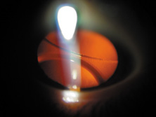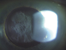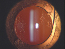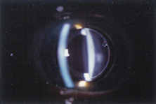 The incidence of substantial positive and negative dysphotopsia with the single-piece AcrySof® design is very low and the frequency of IOL exchange required is even lower. In J.A.D.'s series of 7234 consecutive single-piece AcrySof® IOLs from April 2001 to December 2004, the following was recorded prospectively: positive dysphotopsia, 11 cases (0.15205%); negative dysphotopsia, 26 cases (0.35941%); total dysphotopsia, 39 cases (0.53912%). Nine IOL exchanges for dysphotopsia (four positive and five negative) were accomplished (0.12%) cases. All cases were exchanged with AMO SI40s. Of those with positive dysphotopsia, three patients had symptoms improve, and one patient experienced no relief. Of those with negative dysphotopsia, three patients had symptoms totally resolve, and two patients had only improvements. Of the seven patients with bilateral surgery, five had AcrySof® IOLs implanted in their fellow eye with no dysphotopsia symptoms. There were no patients with an IOL exchange who had bilateral symptoms. During that time one Clariflex IOL was exchanged for negative dysphotopsia and one AMO AR40E was exchanged for positive dysphotopsia. AMO engineers created a round-edge acrylic foldable design, the AR40. This IOL performed well but was eventually found to have a higher incidence of PCO.260 Aware of the attributes and problems associated with the square edge, AMO engineers created a modification so that only the intuitively critical posterior edge would be square but the middle and anterior portions would be rounded (the OptiEdge™) (Fig. 99) to reduce the ability to create reflections. This IOL, the AR40E, has been found to produce negative dysphotopsia (peripheral dark shadows) in approximately 1% of patients.260 Confident in their design, AMO engineers adapted this compound edge to their silicone optic product, producing the Clariflex IOL. This IOL is not free of dysphotopsia; the only Clariflex J.A.D. ever implanted had to be exchanged (Fig. 79) because of the perception of a temporal and inferior dark arc-like shadow. An SI40 resolved the problem. Pharmacia's engineers wanted to recruit the apparent advantage of the square-edge design also, and it was incorporated into several models including the Technis IOL. Because of the lower index of refraction, these optics are thicker and have thicker edges, for example, 0.6 mm in the case of the Technis IOL. Peripheral dark shadows are also visible in approximately the same proportion of patients when using the Technis IOL as well. Although the problems with dysphotopsia are rare, they are extremely troublesome for some patients. Because of this some surgeons have continued or renewed their interest in round-edged silicone IOLs such as the three-piece design SI40 or the STAAR plate haptic design AA4203. But even round-edge silicone IOLs can produce dysphotic symptoms in predisposed patients.260 Round-edge silicone IOLs, three-piece or plate haptic, are good choices for most patients just as are square-edge acrylics. There is a balance of risks of problems associated with each; increased inflammatory sequelae and PCO with one style versus pseudophakic dysphotopsia with the other. It is preferred to consider implantation of a round-edge IOL in patients under two circumstances. First, some patients reveal a lifetime history of glare (day and/or night) and/or night driving difficulty because of headlight glare. It is likely that they will be more prone to the same glare symptoms after surgery as well as being more prone to pseudophakic dysphotopsia. This would be particularly true if patients have corneal endothelial dystrophy. Second, this style optic may perform better if patients have as their subjective chief symptom blur and glare symptoms out of proportion to their objective cataract appearance, even in the absence of a lifetime glare history. Consideration for the rounded-edge IOL is even greater if moderate corneal guttata are present. Most patients adapt to the dysphotopsia and find that it resolves for the most part within a few months. This may be from adaptation, fatigue, or capsular fibrosis.257 Sometimes posterior capsular striae are present, but they have not been found to affect vision.264 Rarely, the phenomena are so disturbing that IOL exchange for an IOL made of another material may be required. This usually but not always solves the problem. Although rarely seen with improved design acrylics, if positive pseudophakic dysphotopsia symptoms are substantial, an IOL exchange can be contemplated within 1 or 2 weeks or after surgery because these symptoms will not improve enough to satisfy a patient with time. If negative pseudophakic dysphotopsia symptoms are still bothersome after 2 months, an IOL exchange should be contemplated (Fig. 100). In rare cases, Alphagan P has provided some varying relief in symptoms while waiting for definitive improvement in positive or negative dysphotopsia symptoms. Nd:YAG laser treatment does not resolve this symptom and makes IOL exchange more difficult if it is found to be necessary. Nd:YAG laser posterior capsulotomy has occasionally brought relief to the patient who sees a line of light that seems to be at right angles to a very prominent fold or folds in the posterior capsule intuitively creating a kind of Maddox rod-type effect (Fig. 101). The edge and anterior surface reflection theories are probably both correct; positive dysphotopsia is predominantly caused by anterior surface reflections, and negative dysphotopsia is predominantly caused by edge reflections. Perhaps some reflection from the corneal endothelial surface is involved. Maybe light is just missing the optic and passing between the space between the anterior optic surface and the posterior iris and shining on the retina creating an obscuration or shadow. As of 2004, the exact cause of dysphotopsia is unknown, but the varying circumstances make understanding difficult: Dysphotopsia occurs only in eyes requiring normal to 