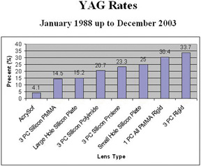 As of the end of 2004, more than 19,500 IOL-related specimens were accessioned to Dr. Apple's laboratory; almost 8,500 eyes obtained postmortem contained IOLs. More than 5,000 eyes with PC IOLs were accessioned between January 1988 and December 2003, the time period of his latest analysis. Approximately 1500 were foldable designs (as of December 2003). Only eyes undergoing operation in the United States were available for this analysis. Each studied globe was accessioned and categorized according to the presence or absence of an Nd:YAG posterior capsulotomy as determined using the Miyake-Apple posterior photographic technique. The Nd:YAG rate seen with each IOL design was determined by noting the total number of accessions of the IOL style and then determining the number of Nd:YAG lasers performed on the IOLs in each group. The data for eight common lenses design were collected. These are listed in increasing order according to the percentage Nd:YAG rate of each IOL as of December 1, 2003 (Fig. 129). The IOL with the lowest Nd:YAG laser posterior capsulotomy rate was the Alcon AcrySof® IOL. As of December 1, 2003, 488 AcrySof® IOLs had been accessioned and only 20 Nd:YAG lasers were noted, a low rate of 4.1%. Clinical studies also showed low PCO rates for the AcrySof® acrylic IOL.46,291–293,296 In one photographic study with 2 years of follow-up, PCO rates were reported as 44% in PMMA, 34% in silicone, and 12% in acrylic IOLs (Figs. 104, 105, 106).294 In another study, Nd:YAG rates were constant at between 1% and 2% per year.344 The data from this article have been updated through 2004 to reflect the 4-year postoperative experience with the single-piece AcrySof® IOLs. Even though the Achilles heel may be suggested, it would seem from this data that an increase in Nd:YAG rate has not occurred with the single-piece versus the three-piece AcrySof® (Table 1). However, longer follow-up of use in younger patients may eventually show an increase in PCO in these IOLs. Other studies have shown that silicone IOLs seem to incite a more vigorous capsular reaction, with YAG rates of 24% to 40%.61,315 More recent studies suggest that modern silicone IOLs made of second-generation (e.g., silicone called SLM2 used in the Allergan SI40 and SA40) materials may also be associated with a PCO rate similar to that of the AcrySof® IOL.74 The Hydroview IOL, although easy to handle and implant, has been associated with higher rates of PCO than PMMA.345 Lower rates have also been found with HEMA IOLs compared with PMMA IOLs.346 Most pediatric IOLs implanted are now foldable acrylic. Primary posterior capsulotomy either by anterior or posterior vitrectomy is usually recommended for children less than 2 years of age.347–350 After the age of 2 years, the AcrySof® IOL has been found to provide good visual rehabilitation with a delayed YAG experience that precludes the need for primary posterior capsulotomy with vitrectomy. Vigorous opacification occurs in children, but late enough that Nd:YAG posterior capsulotomy can be performed. To summarize, the variations in observed and reported PCO rates are the result of multiple factors, some dependent on the surgeon or the IOL. Regardless of IOL style, the surgeon must bring careful atraumatic surgery,219,298 circular capsulorrhexis with 100% circumference overlap by 0.25 to 0.5 mm,305,351 meticulous cortex aspiration with careful capsular vacuuming of all obvious remnants on the posterior and even anterior capsular surfaces, and “in the bag” fixation of the IOL. The combination of IOL features and surgical execution combine to produce lower PCO rates. For many years researchers have tried many means to prevent or delay PCO, for example, by chemical means. New methods, including equatorial application of the CO2 laser352 and Tranilast eye drops,353 hold some promise for inhibition of PCO. Many chemical or pharmacologic substances do work, but problems of toxicity to adjacent structures such as the corneal endothelium have not yet been satisfactorily resolved. The sealed capsular irrigation device was developed to solve this problem and is currently being investigated.354 Lactocrumenasia Lactocrumenasia was originally described by David Eifrig as a milky liquid that accumulated within the capsular bag behind the posterior optic surface (Fig. 130).355 This material will be instantly released into the space in front of the anterior hyaloid membrane and into the vitreous as the membrane is disrupted during the Nd:YAG posterior capsulotomy. This should not be a problem, but in at least one case, micropipette cultures of this material grew propionibacterium acnes.356 Anterior Capsule Opacification, Capsule Fibrosis, Capsular Contraction, and Optic Decentration A discussion of capsule contraction is really an extension of the discussion on PCO because both are caused by residual proliferating LECs. After surgery, some contraction of the anterior capsular opening and the equatorial diameter is inevitable and normal. The amount of contraction depends on predisposing anatomic factors, surgical technique, the size of the CCC, IOL material, and IOL design. Although PCO is the result of proliferation and migration of the equatorial LEC (“E” cells), anterior capsule fibrosis is the result of fibrous metaplasia of the anterior capsular cells (“A” cells). The latter cells cannot migrate, but they develop contractile ability. That can explain why PCO is an optical problem, and the capsule contraction is a dynamic structural one. It represents the consequences produced when capsular fibrosis, created by the metaplastic lens epithelium, leads to an apparent contraction of the CCC diameter. This shrinkage of the CCC opening is created by a fibrotic gathering of the anterior capsule from the anterior equatorial capsular tissue. Capsular contraction manifests itself with either or both capsule and IOL effects. The most mild capsular contraction is created by the very milde