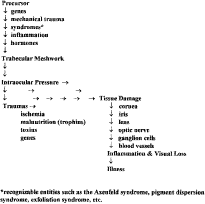 The time spent in the operating room is a small fraction of the time spent in performing glaucoma surgery. For every hour the surgeon spends operating, 10 or 20 hours are spent in preoperative preparation and postoperative management. Even if surgical technique is perfect, if the preoperative preparation is inadequate or the postoperative management is inappropriate, the result often is unsatisfactory. This chapter emphasizes the importance of preoperative evaluation and postoperative management. This emphasis does not suggest that technique is not important. Every aspect of the 3- to 6-month period of the surgical episode, which includes time in the operating room, constitutes an essential building block in successful glaucoma surgery.1 This point is often overlooked by those not deeply experienced in the surgical care of patients with glaucoma. INDICATIONS FOR SURGERY Glaucoma comes in many forms and varieties. In this chapter, glaucoma means a condition in which the ocular tissues of the eye become damaged at least partially because of intraocular pressure (IOP) higher than the eye can tolerate. An essential part of this definition, then, is that the IOP plays a role in the development of the damage. The reader should note, however, that the word elevated is not included in this definition. The IOP of the healthy eye is actually high, that is, sufficiently elevated so that it has the potential for causing damage to tissues. Indeed, rather than wonder at the occurrence of glaucoma in people with average levels of IOP, it is more appropriate to wonder why it is that everybody does not develop glaucomatous optic nerve damage at a usual level of IOP. The structure of the eye is truly remarkable to allow it to carry a pressure of 15 mm Hg and have tender, minuscule fibers passing through flexible channels in the lamina cribrosa without those neurons becoming damaged routinely. Thus, glaucoma is ocular tissue damage at least partially resulting from IOP. In the acute glaucomas this damage occurs to the cornea, iris, and lens and, given a sufficient duration of time, to the retinal ganglion cells as well. In the chronic forms of glaucoma, damage usually is within the optic nerve itself, with secondary damage to the retinal ganglion cells or, in some cases, primarily in the ganglion cells themselves. The trabecular meshwork also becomes unhealthy by mechanisms that are at least partially unrelated to those responsible for the optic nerve damage. A schema of the pathogenesis of tissue damage in the glaucomas is shown in Figure 1. The pathway to tissue damage involves direct and indirect damage from the pressure within the eye, combined with a variety of traumas that directly or indirectly damage the tissues. The IOP is largely a result of how the trabecular meshwork is functioning. Reduction of IOP is at the heart of preventing damage or allowing damaged tissues to repair themselves. The modulation of other factors, such as vasospasm, anemia, excessively low blood pressure, and neurotoxins, is appropriate, but, to date, little evidence demonstrates actual benefit from such methods of treatment. The tissues of the eye can also be damaged by the treatments themselves. Patients with glaucoma lose vision or have a diminishment of their quality of life for at least four different reasons. First, patients can lose vision or develop pain because of the damage to the tissues that the glaucomatous process causes. Second, patients can be less healthy as a consequence of the treatments applied to prevent the glaucomatous process from causing damage. The importance of this in the well-being of patients is too often forgotten or ignored. One of the most critical aspects of caring for patients with glaucoma is to “fit the punishment to the crime,” so that the treatment does not cause more disability than the disease itself. This is discussed in detail later. Third, patients with glaucoma may become impaired because of the mandatory death of a certain number of retinal ganglion cells each year. The rate of this mandatory cell death has been suggested to be around 3000 to 5000 cells per year. This level may not be of consequence in a person with a full complement of around 1,250,000 ganglion cells. However, in a patient with advanced glaucomatous nerve damage, who may have only 50,000 ganglion cells left, a loss of 5000 cells per year would be associated with noticeable and devastating visual deterioration. However, it would be prudent to add a caveat: It is probably unwise to base therapy on the assumption that a patient with glaucoma is going to get worse because of mandatory loss of cells related to aging. First, it is not known whether this principle applies to all cells. It is possible that a proportion of retinal ganglion cells are preprogrammed to live longer than others; it is not rare to see patients with far-advanced glaucoma with a residual central island field (less than 5 degrees) to maintain that island of vision for 10 of 15 years. This seems contrary to the theory that, when 50,000 or so ganglion cells remain, eventual blindness is a certainty. Furthermore, because lowering IOP presumably will not affect the rate of preprogrammed cell death, it is not logical to perform surgery to try to prevent this cell death. Fourth, patients with glaucoma can lose vision or develop pain because they have an illness in addition to the glaucoma: a pituitary tumor, juxtapapillary chorioretinitis, macular degeneration, and so forth. Visual field loss mimicking glaucoma can be caused by a prominent nose, myopic peripapillary changes, congenital pits of the optic disc, anterior ischemic optic neuropathy, a hypotensive episode, optic neuritis, compressed lesions of the optic nerve or chiasm, occipital lobe lesion, and juxtapapillary choroiditis. Cupping and pallor of the optic nerve that mimics glaucoma can be a normal variation or a consequence of anterior ischemic optic neuropathy, myopic changes, a congeni