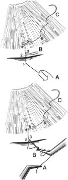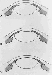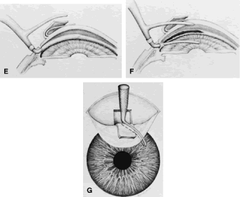 To treat a flat anterior chamber successfully, the cause must be determined first. The nature of the bleb, the level of IOP, and the natural history of the condition in the patient usually give adequate clues to permit an accurate diagnosis (see Table 23). It is helpful to distinguish between various types of flat anterior chamber. Our classification is shown in Figure 56. In type 1 flat anterior chamber, the peripheral iris contacts the corneal endothelium. In type 2 flat anterior chamber, almost all of the iris, both in the periphery and more centrally, is in contact with the corneal endothelium. In type 3 flat anterior chamber, there is no remaining chamber; the lens or in the aphakic patient, the vitreous face, or in the pseudophakic patient, the intraocular lens, is in contact with the corneal endothelium. Type 1 flat anterior chambers occur commonly, especially in association with excess filtration. When excess filtration is the cause, it usually clears spontaneously, and the only required treatment is vigorous use of cycloplegics and mydriatics. In some cases, a type 1 flat anterior chamber becomes a type 2 flat anterior chamber, which is a poor prognostic sign, especially if the pressure is falling and the bleb flattening. Type 2 flat anterior chambers can recover spontaneously or may progress to type 3 flat anterior chambers. Depending on a variety of factors, the surgeon may choose different forms of management: (1) observing the patient without performing further surgery; (2) reforming the anterior chamber with air, viscoelastic material, or saline; or (3) draining the choroidal detachment and reforming the anterior chamber. One study144 showed that in most cases, the preferable method of management is prompt reformation of the anterior chamber with the viscoelastic material. When this reformation is done, the IOP tends to be lower than when the eye is observed without further surgery. The method of draining the choroidal detachment and reforming the anterior chamber also results in lower IOP than when eyes with grade II flat anterior chambers are merely observed; however, the complication rate with this more extensive procedure is greater, and a more significant loss of visual acuity occurs. Consequently, although this method of treatment is effective in reforming the anterior chamber and obtaining a good IOP, it produces a less satisfactory visual acuity than reformation of the anterior chamber with viscoelastic material without draining the choroidal detachment. Furthermore, reformation of the anterior chamber can be done easily as an outpatient procedure, whereas drainage of the suprachoroidal effusion requires an inpatient surgical procedure in the operating room. Treatment must be individualized. However, whenever the pressure is consistently falling, the bleb flattening, and the chamber shallowing, despite reformation of the anterior chamber with viscoelastic material, the course is clear. Drainage of the associated choroidal detachment and reformation of the chamber are recommended. Eyes should not be left with flattening blebs and low pressures because the lack of fluid flow through the sclerostomy will ensure failure of the filtering procedure. Type 3 flat anterior chambers are surgical emergencies. If they are not corrected promptly, the corneal endothelium will be damaged permanently. CORRECTING FLAT ANTERIOR CHAMBERS Injection of Viscoelastic Material. The eye is examined meticulously to find the paracentesis track that should have been made at the time of surgery. It is helpful to note the location of this paracentesis track at the time of surgery so that it can be found more easily postoperatively. If the paracentesis track can be identified easily, a 30-gauge blunt cannula is placed on the syringe of viscoelastic material. If the paracentesis track cannot be found, a sharp 30-gauge disposable needle is placed on the syringe containing the viscoelastic material. We prefer to use a 30-gauge needle. A variety of viscoelastic substances can be used. Sodium hyaluronate is less viscous but more easily injected and is a suitable substance in most eyes. If the surgeon wishes to employ a substance with higher viscosity, the injection will be more difficult, but the duration of formation of the anterior chamber will be longer, which has advantages in certain situations. It is important not to fill the needle with the viscoelastic material. Air should be left in the needle. With the patient seated at the slit lamp, the eye is anesthetized thoroughly with multiple instillations of a topical anesthetic agent, such as proparacaine. The eye is flushed well with an irrigating solution. A topical antibiotic is instilled. After the eye has been prepared, the patient is positioned at the slip lamp in a comfortable position. An assistant elevates the upper lid with an applicator. Excellent fixation of gaze is requested and obtained. With the patient seated comfortably, the cannula or needle is inserted into the paracentesis track. Once the needle is well into the anterior chamber, the injection is started. If a sharp needle is used, it is essential to follow the major guideline of any paracentesis track (see Fig. 5). Specifically, the needle must never point toward the iris or lens but must be in a plane parallel to the iris or lens. If the syringe is rolled in the fingers as the needle is advanced, the needle tends to cut through the cornea more easily, facilitating entry into the anterior chamber. Once the needle is thought to be in the anterior chamber, the plunger of the syringe is pressed, forcing the air out of the needle. If the tip of the needle is not all the way in the anterior chamber, the air will not form a bubble that rises spontaneously. The surgeon, by noting the air, determines that the needle is in the chamber. The viscoelastic material is injected slowly so that it does not push the iris in front of it, which may cause the pupil to be deformed and the iris to ex