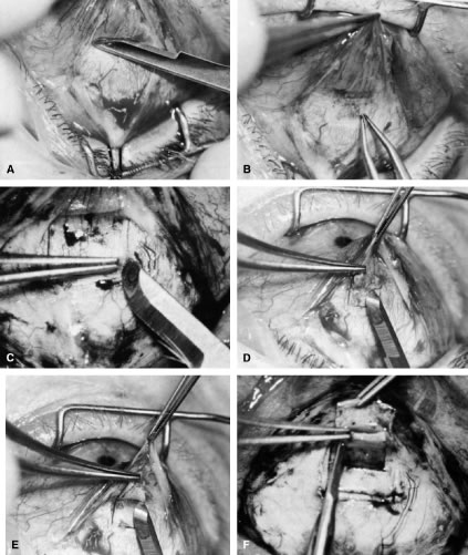 TUBE ENTRY. The tube is trimmed so that there is a bevel facing anteriorly and 2 to 3 mm will appear within the anterior chamber. After scrutiny for the ideal tube entry site, a 23-gauge needle is passed through the limbus to create a tight entry site. The tube tip should not be touching either the cornea or lens. Alternatively, a pars plana entry could be considered if a pars plana vitrectomy has been performed.134 After reforming the anterior chamber with balanced salt solution, the valved shunts should allow for fluid runoff. If the unvalved tube has been tied tightly so that there is no flow, 1- to 2-mm venting slits are made with a microblade within the tube proximal to the external ligature. This will allow for some outflow through the tube in the early postoperative period. RIPCORD SUTURE PLACEMENT. For the nonvalved shunts, the 4-0 nylon intraluminal suture is passed into the subconjunctival space of an adjacent quadrant (usually inferotemporally). This allows for easy removal postoperatively to fully open the tube for aqueous outflow. WOUND CLOSURE. A donor patch graft is placed over the tube to reduce the risk of tube erosion through the conjunctiva135 (Fig. 50). Potential donor materials include: sclera, fascia lata, and pericardium. The conjunctiva is repositioned to carefully cover the tube and overlying patch graft. For a limbal-based conjunctival flap, a two-layered closure of Tenon's layer and then conjunctiva is recommended.