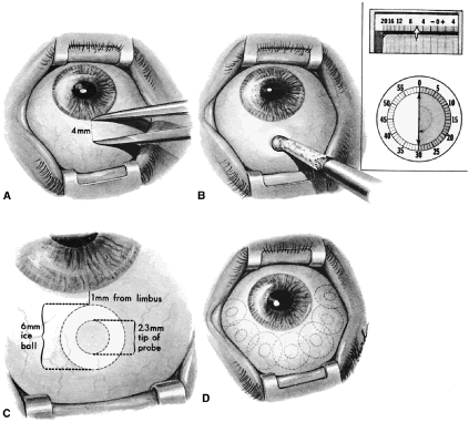 The most common indication for cyclocryotherapy is an aphakic glaucoma that is unresponsive to medical therapy, especially when the eye has an associated problem such as inflammation or neovascular changes. It rarely is used in phakic patients because it is highly cataractogenic. Cyclocryotherapy has been advocated as appropriate treatment for patients with blind, painful eyes and elevated IOP. In our opinion this treatment rarely is justified. It is unusual for an eye to be persistently painful on the basis of elevated IOP itself. A sudden rise of IOP usually causes pain, but when the pressure remains elevated for months, the pressure itself rarely is responsible for discomfort. Hence, treatment primarily designed to lower chronically elevated IOP is not entirely rational. In addition, most of these patients obtain pain relief from measures directed at limiting inflammation, such as topical atropine and corticosteroids, whereas cyclocryotherapy increases inflammation. Operative Technique The cyclocryotherapy procedure itself is painful and requires effective anesthesia. A retrobulbar injection of bupivacaine 0.75% containing hyaluronidase almost always is adequate. Because the position of the ciliary body relative to the limbus varies from eye to eye, an effort should be made to locate the ciliary body before the procedure is done. This position can be approximated in most cases simply by inspection; transillumination is helpful when landmarks are less clear. Applications should be centered over the ciliary body; if this site is close to the limbus, it is better to place the applications slightly more posteriorly to ensure that the iceball does not extend into the cornea, where it could damage the corneal endothelial cells (Fig. 19). The intensity of treatment should vary with the condition of the patient. Associated factors are shown in Table 27. In most cases, we use six to eight applications spread over the inferior two quadrants, avoiding the 3 and 9 o'clock positions. If IOP does not fall adequately within 1 week, the procedure is repeated, treating the two quadrants between the 12 and 6 o'clock positions and avoiding the 3 o'clock position. If pressure is still not lowered adequately, a third treatment is placed in the superior two quadrants.