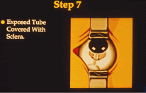 Postoperative Care Postoperative care is similar to trabeculectomy, but gonioscopy is even more critical to visualize the cavern. It is not unusual to see conjunctival microcysts for the first 3 weeks, but if flap closure is tight, bleb formation is unusual. Postoperative IOP is usually in the 10 to 20 mm Hg range during the first week and may increase over a 3-week period. Occasionally, goniopuncture of the TDM is necessary if IOP becomes unmanageable (Fig. 39). Iris incarceration may require iridoplasty, and Descemet's detachment has been reported (Fig. 40). It is unusual to see choroidal effusion or shallow anterior chamber. If optic nerve damage appears imminent, goniopuncture of the TDM along with suture lysis will usually encourage filtration during the first two postoperative weeks. Complications include rupture of Descemet's window, choroidal penetration, hyphema, IOP spike, choroidal detachment, and cataract formation. DEEP SCLERECTOMY WITH COLLAGEN IMPLANT The technique for DSCI (Figs. 41, 42, 43, 44, and 45) is similar to DSVC. Steps 1 through 12 are the same; except step 9 is eliminated and viscoelastic is not inserted underneath the scleral flap. DSCI procedures typically produce a bleb. Bleb formation even occurs without insertion of the collagen implant. One study found raised blebs in 24% of eyes, diffuse shallow blebs in 34%, and no noticeable bleb in 42% of eyes.108 Pressure reduction in eyes without noticeable blebs may be related to flow through Schlemm's canal or uveoscleral outflow. Complete resorption of the collagen implant typically occurs between 6 and 9 months.117 The success rates for deep sclerectomy are variable depending on technique and use of antimetabolite. Mermoud and coworkers104 found comparable pressure reduction between trabeculectomy (53.2%) and DSCI (48.2%). However, goniopuncture with the Nd:YAG laser was necessary in 23% of patients with a mean time of 9 months after surgery. Goniopuncture dropped the IOP from a mean of 21 mm Hg to 12 mm Hg. Another study found the need for goniopuncture at 41%.118 Welsh and colleagues119 found that approximately 10% of patients required repeat surgery for uncontrolled IOP, and Dahan and Drusedau108 found that repeat surgery was necessary in 85% of eyes with prior medical therapy. Complications with a greater than 5% chance of occurrence after DSCI include: bleb encapsulation, choroidal detachment, wound leak, bleb fibrosis, hyphema, and cataract progression.120 As long as complications continue to arise related to bleb-forming glaucoma surgery, efforts to create the perfect bleb-less or minimal-bleb glaucoma procedure will persist. Only time and controlled clinical and laboratory studies will reveal the role of NPFS in the long-term care of the glaucoma patient. Nonpenetrating procedures have created a renaissance in the anatomy and surgery of the outflow pathways. TUBE SHUNTS FOR GLAUCOMA Introduction When a guarded filtration procedure is unlikely to be successful, tube shunt surgery may be helpful in improving aqueous outflow.121–123 A tube shunt exits the anterior chamber at the limbus or the vitreous cavity at the pars plana. It extends posteriorly to a reservoir anchored behind the insertion of the recti muscles. In this system, the filtration bleb is displaced from the typical limbal region as seen with a trabeculectomy to a more posterior location. In this area the blebs are thick-walled and vascular unlike many limbal blebs that are thin and avascular. A number of clinical situations with uncontrolled glaucoma seem to be best served by tube shunt placement (Table 29).