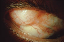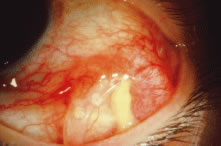 Hypotony may be due to a high outflow state and/or choroidal effusion with hyposecretion. If there is a profound wound leak, it may need to be repaired. If the anterior chamber has shallowed with a risk of cornea to lens touch, then reformation of the anterior chamber with a viscoelastic and possible choroidal effusion drainage may be required. Temporarily tying off the tube completely in nonvalved shunts may be necessary in certain cases to help resolve persistent hypotony. LATE POSTOPERATIVE PERIOD. After several weeks if there is an elevation of eye pressure there are several possible etiologies: bleb encapsulation, steroid response, excessive subconjunctival fibrosis, or occlusion of the tube tip (Fig. 52). At about 1 month after surgery, there is often an IOP rise despite a large, thick bleb overlying the reservoir indicating an encapsulation phase (Fig. 53). This often resolves with conservative management with glaucoma medication. However, needling of the bleb or surgical revision with partial excision of the bleb wall may be required in resistant cases.137 Eye pressure elevation secondary to steroid responsiveness138 may be handled by switching to a less potent steroid, tapering off the topical steroid, or switching to a topical nonsteroidal agent to suppress inflammation. Failure of the tube shunt because of conjunctival scarring may require another surgical intervention such as a second tube shunt in another site or cyclophotocoagulation.139 If the tube tip is enveloped by a fibrous sheet or iris synechiae, it may be re-opened by YAG laser application.140 Often the tube tip must be repositioned to another entry site. With direct cornea or lens apposition with the tube, corneal decompensation or cataract development will ensue. Repositioning of the tube should be promptly performed at the earliest sign of localized corneal edema. Eyes with corneal grafts are of greatest concern because of potential danger to the graft.141 The large posterior blebs seen with shunts may mechanically limit globe movement and result in diplopia.142 If present in the primary position, prisms may resolve the problem, but some patients may require strabismus surgery or even removal of the shunt. Despite use of a patch graft, the tube may erode through the graft and conjunctiva143 (Fig. 54). Repair must be undertaken because there is a serious risk of intraocular infection. Insertion of another patch graft and reapproximation of the overlying conjunctival defect is usually successful. Extrusion of the reservoir is a more serious and difficult problem to solve satisfactorily (Fig. 55). Closure of the conjunctival defect is hard to maintain, and typically removal of the shunt is necessary. Placement of another shunt at another site should be considered.