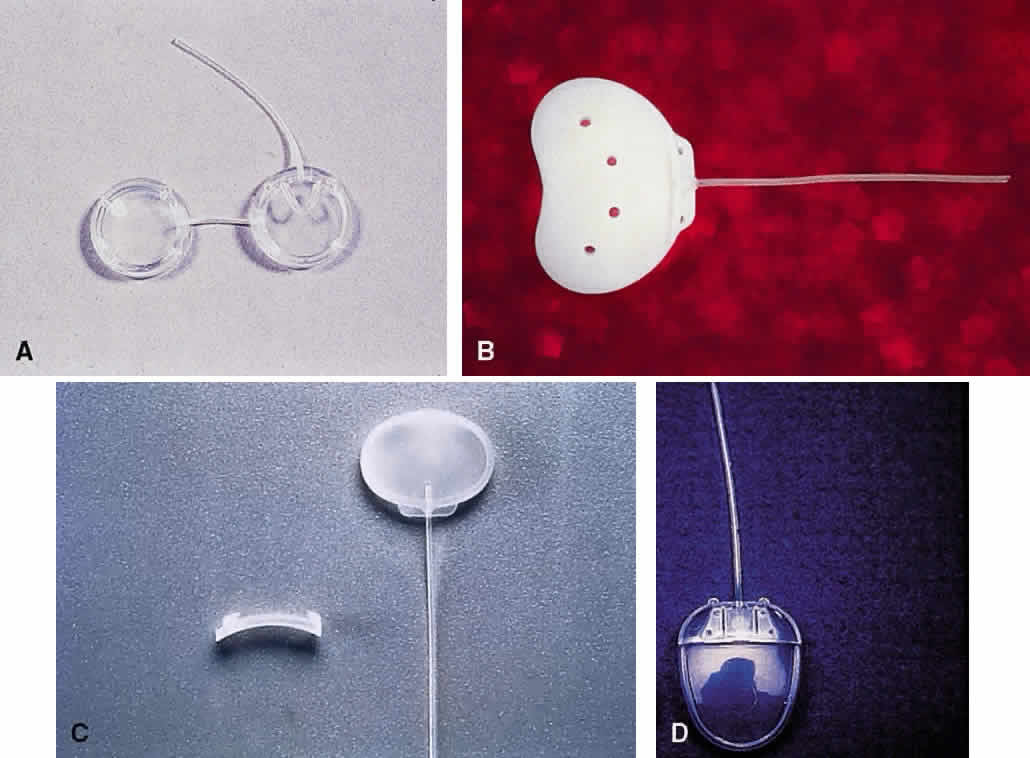 The Krupin shunt is a two-piece device with a pressure-regulated valve that was modified from the original translimbal tube shunt17 to a tube to a 180° band (No. 220 Silastic implant reservoir)19,48 and a tube to an oval reservoir plate.23 The opening pressure of the valve is designed to be 11 to 14 mmHg and the closing pressure is 2 mmHg. Unfortunately, the opening and closing pressures may vary significantly49 and this variability may not be discovered until the procedure is completed. The Joseph valve shunt is a one-piece design that is similar to the two-piece Krupin shunt.50,51 Lavin and coworkers52 suggest that the one-piece design minimizes the possibility of fibrous ingrowth at the tube-plate junction. The Baerveldt shunt was developed to provide easy placement in a single quadrant and also provide a large surface area. It has a soft, pliable reservoir of silicone and a large surface area (200 to 425 mm) for aqueous pooling.53 The placement of the reservoir underneath the rectus muscle insertion, however, promotes fibrous encapsulation of the reservoir to the muscles, which leads to disturbing diplopia.54 The design has been modified, with fenestrations in the reservoir that may allow tissue tacks to limit bleb elevation and may eliminate rectus muscle imbalance and diplopia. The White pump shunt has had limited clinical evaluation but appears to be linked with several serious problems.55,56 One obvious flaw is that the distal tube end is prone to fibrosis, with closure of the tube resulting because there is no reservoir in the original design. The Ahmed valve shunt is also a singlereservoir system, with a rigid plastic plate.23,57 The valve is composed of two thin silicone membrane leaflets, using the Bernoulli principle. The inner outlet is wider than the outlet, which allows patency even at low pressure differentials. |