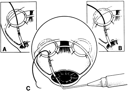 suture inferonasally. The exposed suture end is grasped with a forceps