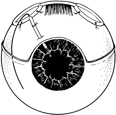 PRIMING THE VALVE. By forceful irrigation through the tube, the two silicone leaflets that make up the valve are separated. A stream of fluid should be seen entering the plate zone from the valve region. If this maneuver is neglected, there may be no flow in vivo and intraocular may become elevated postoperatively and require reoperation. SHUNT POSITION. The reservoir plate fits between the rectus muscles and should be sutured into position with the anterior reservoir edge about 8 mm from the limbus. There should be no override of either the superior or lateral rectus muscle. Placement of the shunt in the superonasal position, especially in short eyes, may come perilously close to the optic nerve. The long anterior posterior dimension of the shunt makes it a less-than-attractive shunt placement in the superonasal region. |