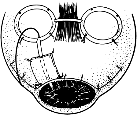 ANESTHESIA The operation may be lengthy but virtually all adult patients can be managed safely and comfortably with local anesthesia. The local anesthesia may be supplemented by subconjunctival infiltration with local anesthetic, which in turn is helpful in separating scarred subconjunctival tissue from the sclera. If the intraocular pressure is high (more than 35 mmHg), intravenous mannitol should be given (1 to 2 g/kg) over 30 to 45 minutes whenever medically acceptable. If the intraocular pressure is lowered, the magnitude of the reduction of intraocular pressure with surgery is not as dramatic and the risk of suprachoroidal hemorrhage or massive choroidal effusion may be reduced. EXPOSURE OF THE SCLERAL BED The conjunctival flap is raised by sharp dissection from the insertion at the limbus. The fornix-based flap is elevated, which allows direct visualization for further subconjunctival dissection to bare sclera. Alternatively, a conjunctival incision is made 4 to 6 mm from the limbus to raise a limbal-based conjunctival flap. This is helpful when there is a previous limbal filtration site, which is best avoided. If the old site is inadvertently reopened, the globe becomes hypotonus and it will be difficult to place the shunt reservoir. The superotemporal and superonasal quadrants are exposed with Westcott or curved Stevens scissors. The superior rectus muscle is located with a strabismus hook. The hook is passed from the superotemporal direction to avoid incorporating the superior oblique muscle. A 4-0 silk suture may be passed underneath the superior rectus tendon. Use of an anterior metabolite such as 5-fluorouracil or mitomycin C with tube shunt reservoirs remains controversial. Although it was demonstrated in an animal study that the blebs overlying the reservoir are thinner and contain less connective tissue,61 the clinical use of antimetabolites has not been shown to have any great benefit.62 PLACEMENT OF THE TWO MOLTENO PLATES The Molteno plate with the interconnecting tube slides into the superonasal quadrant (Fig. 4). A curved Hartman hemostat is passed underneath the superior rectus muscle in the temporal to nasal direction. The plate is grasped and pulled underneath the rectus muscle; this tight squeeze may traumatize the extraocular muscles. Placement of the interconnecting tube over the superior rectus muscle usually is sufficient and avoids the difficulty of passing a reservoir under the superior rectus insertion. Posterior to the insertion of the rectus muscles, a partial-thickness scleral pass is made with 6-0 Mersilene suture* on a spatula needle in both quadrants to anchor the plates. The plates are secured by tying one or two 6-0 Mersilene sutures that are passed through the plate anterior positioning holes. The anterior edge of the plates should be no closer than 8 mm from the limbus. Ethicon, Inc, Somerville, NJ. ADJUSTING TUBE FLOW A 4-0 nylon suture is inserted into the distal end of the tube (Fig. 5). A 6-0 polyglactin (Vicryl*) suture is tied externally around the tube. Balanced salt solution is injected through the proximal end of the tube to ensure that fluid passage through the tube meets resistance but is not totally occluded. This approach allows the tube to be partially functional for the first few days and weeks and eliminates the need for an adjunctive trabeculectomy-filtering site for temporary intraocular pressure control, as in situations when the tube is totally occluded. It also ensures that profound hypotony is avoided, as typically occurs if the tube is not partially occluded. The other end of the suture—with the needle—is passed through the subconjunctival space into the inferonasal aspect, where it is externalized. The exposed excess suture and needles are then cut off (Fig. 6). An alternative approach is to totally occlude flow with the external ligature. Venting foots are made in the tube proximal to the external ligature. These vents are created with a sharp microblade and allow fluid flow at high intraocular pressures until the external ligature dissolves or is cut. Ethicon, Inc., Somerville, NJ TUBE PLACEMENT IN THE ANTERIOR CHAMBER The tube is shortened obliquely with a Vannas scissor, so that about 2 mm is in the anterior chamber, with the tube bevel facing anteriorly (Fig. 7). A sharp bevel makes entry through a tight sclerostomy easier. Additionally, the tube opening is less likely to be occluded by fibrin, blood, or ocular tissue. A 23-gauge needle is passed through the limbus, creating a 1- to 2-mm intrascleral tunnel before entry. The external opening is enlarged slightly with the needle to allow easier tube entry. The needle is passed in a direction to keep the tube pointed away from the cornea but not touching the iris or lens. Occasionally, viscoclastic injection is helpful to keep the anterior chamber deep before the tube entry. If the tube insertion is difficult, the 4-0 intraluminal nylon suture can be used as a stent. The tube tip with the suture is kept more rigid and it allows easier entry into the anterior chamber. Alternatively, if a total vitrectomy has been performed, the tube can be placed through the pars plana into the vitreous cavity. PATCH GRAFT Using only a conjunctival closure over the tube may result in conjunctival erosion and tube exposure, with a definite risk for endophthalmitis (Fig. 8). A limbal-based or rotational scleral flap tied over the tube may vault the intraocular portion of the tube anteriorly against the cornea. It is simpler to use donor tissue to cover the tube. The donor tissue may be sclera, fascia lata, cornea, or pericardium. The pericardium is commercially prepared and packaged. The other tissues may be obtained through regional eye banks. Less available but potentially acceptable tissue is amniotic membrane or dura. After the patch is trimmed and thinned to the desired specifications, four 10-0 nylon sutures anchor the patch graft over the tube. Care should be taken to cover the an