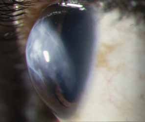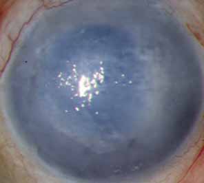 tissue. Full thickness keratoplasty is termed penetrating keratoplasty, and partial-thickness keratoplasty is termed lamellar keratoplasty. The current number of procedures performed on an annual basis is decreasing slightly; a total of 32,744 corneal transplants were performed in 2002, marking the first time since 1986 that the number of procedures performed has been less than 33,000.1 This downward trend has coincided with the decrease in incidence of pseudophakic corneal edema (PCE) (Fig. 1) and aphakic corneal edema (ACE). The percentage of PKs performed to treat PCE has dropped from 19.8% in 2001 to 18.4% in 2002, which was the lowest percent reported in this category in 15 total years of tracking by the Eye Bank Association of America (EBAA). It is possible that this decrease reflects improved cataract removal technique and technology, such as phacoemulsification and posterior chamber intraocular lens placement. The indications for PK have shifted over the past several decades, with PCE the most common indication since 1980, whereas keratoconus (Fig. 2) and ACE were the most common indications prior to 1980.2 Data is tracked for a total of 16 indications for transplant by the EBAA. Pseudophakic corneal edema, keratoconus (particularly in younger patients), Fuchs' endothelial dystrophy (particularly in older patients), and regrafting secondary to rejection or other reasons currently sit atop the list of indications for PK.