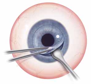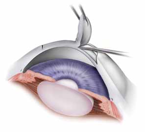 Combined Penetrating Keratoplastyand Cataract Extraction When a cataract extraction is to be performed along with the PK, the patient's pupil is dilated preoperatively with cyclopentolate hydrochloride 1%, phenylephrine 5%, and tropicamide 0.5%, one drop of each every 5 minutes for three total doses. We favor an extracapsular technique in removing the lens nucleus. There are instances, such as in Fuchs' endothelial dystrophy, where corneal clarity is sufficient to facilitate the performance of a continuous curvilinear capsulorrhexis through a paracentesis incision prior to removal of the host corneal tissue. The anterior chamber is filled with viscoelastic substance during this procedure, which allows for additional control of the capsulorrhexis by flattening the anterior curvature of the crystalline lens. By stabilizing the anterior chamber with viscoelastic material, a capsulorrhexis is less likely to proceed radially toward the zonules, causing radial tears and potentially destabilizing the capsular support necessary for adequate intraocular lens positioning. We also favor this approach in the appropriate patient because it minimizes the duration of time spent between removal of the host cornea and placement of the donor tissue. If, however, the cornea is too opaque to confidently visualize the anterior capsular surface, we perform a capsulorrhexis with an open anterior chamber and use an extracapsular technique for removal of the cataract unless obvious lens dislocation or significant traumatic zonular rupture necessitates an intracapsular cataract extraction. A small stab incision is made in the central capsule with a bent needle cystotome, and the edge is grasped with fine Utrata capsulorrhexis forceps. The capsule is gently torn circumferentially to create a smooth-edged, round opening. To facilitate removal of the entire lens nucleus, the opening should be 5 to 6 mm in diameter. If the tear extends toward the anterior zonules it will begin to turn outwardly and may result in a tear extending to the equator of the lens. If this occurs, the capsulotomy should be restarted in the opposite direction with fine scissors and completed using the Utrata forceps. The anterior capsule is then removed with forceps. The lens is loosened from the capsular bag by introducing a cannula just under the capsule and irrigating fluid around the periphery of the lens cortex (i.e., hydrodissection). Visualizing a wave of fluid traversing the red reflex can be helpful in confirming adequate hydrodissection. The lens is left in place until the cornea is trephined. The chamber is reformed and the paracentesis wound is secured by placing a 10-0 nylon suture. After the successful trephination of host tissue, attention can then be turned back to lens removal. The lens can be gently hydrodissected once again and rotated out of the capsular bag using a 25-gauge hydrodissection cannula. If adequate hydrodissection has been performed earlier, the lens is usually easily removed. If required, slow, steady, and gentle pressure at the 6 o'clock and 12 o'clock positions just posterior to the limbus with a muscle hook or lens loop and forceps can help express the lens nucleus. Residual cortex is removed with either a manual irrigation-aspiration cannula, such as the Simcoe cannula, or with an automated irrigation-aspiration setup. The former allows for a central aspirating port and a peripheral irrigation port to minimize the amount of tension placed on the capsular bag. Cortical removal is more tedious and time-consuming in an open-sky technique than in a closed system because no fluid pressure can be built up and air frequently enters the aspiration port. Caution must be exercised to not tear the posterior capsule or rupture the zonules by rushing. Capsular stability provided by a successful capsulorrhexis makes cortical cleanup much easier. The most commonly accepted method for visual rehabilitation after cataract extraction is implantation of an intraocular lens. This is also true after corneal transplantation; the combination of penetrating keratoplasty, cataract extraction, and intraocular lens implantation has become known as the triple procedure. We prefer posterior placement of the intraocular lens within the capsular bag. Placement within the capsular bag reduces contact of the optic and haptics to the pigmented, vascularized uveal tissue, reducing the risks of haptic erosion into vascular structures and the constant chafing on the uvea that may lead to chronic, low-grade uveitis, pigment dispersion, and glaucoma. In the absence of adequate capsular support, the surgeon can place an intraocular lens in the anterior chamber. Alternatively, one can place a fixated posterior chamber intraocular lens with either iris or scleral fixation. There are anterior chamber intraocular lenses currently available that are relatively well tolerated by the corneal endothelium. These lenses are relatively easy to place and, when accompanied by a surgical peripheral iridectomy, can be a viable option in older transplant patients. However, because an anterior chamber lens is positioned anterior to the pupil, the iris cannot protect the graft endothelium from the optic. Even with the use of viscoelastic substances, significant endothelial cell loss and possible graft decompensation may result from intraocular lens touch. In younger patients (under 50) in whom longer term graft viability and endothelial function needed, implantation of a lens anterior to the capsule (in the ciliary sulcus) or a suture fixated lens may be possible and preferable to an anterior chamber lens. Intraocular lens suturing techniques are discussed in the section on aphakic and pseudophakic keratoplasty. The technique involved in placing the posterior chamber intraocular lens into the capsular bag is relatively simple and is aided by having an 8-mm opening in the cornea through which to work. A small amount of viscoelastic is injected through a 30-gauge b