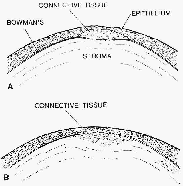is corneal topography to demonstrate irregular astigmatism. The corneal epithelium is removed over the involved area by gently scraping with a dry cellulose sponge (Weck-cel) or a disposable scarifier blade (Grieshaber 681.01 or Beaver 59). After epithelial removal, the surface should be kept dry to facilitate visualization of subepithelial fibrous plaques or focal accumulations of aberrant basement membrane material. With the aid of a dry cellulose sponge, cleavage planes between the subepithelial fibrous tissue and Bowman's layer can often be located and exploited. After an edge of the subepithelial fibrous membrane is identified, the tissue can be stripped and peeled with the aid of jeweler's forceps, frequently as a continuous sheet, thereby leaving Bowman's layer unharmed. A scarifier may be used to gently scrape or dissect more firmly adherent tissue. Sharp incision or dissection should be avoided to prevent damage to the underlying Bowman's layer or stroma. The cleared corneal surface can be polished with a cellulose sponge or lightly scraped with a scarifier (Fig. 1).1 Postoperatively, antibiotic ointment is applied and the eye is pressure-patched for 24 hours. Thereafter, antibiotic ointment is initially applied four times a day and reduced in frequency over 2 weeks. Re-epithelialization is usually complete in 5 to 7 days. Contact lens wear can be resumed after 2 weeks. |