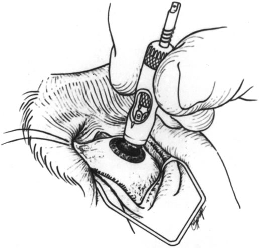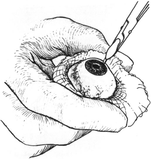Conjunctival flaps play a less important role in the treatment of perforations than they do in the prevention of progression of corneal melting. Nonetheless, in some leaking descemetoceles and small perforations, conjunctival flaps may serve as a temporizing measure before keratoplasty.14 With the use of tissue adhesives and patch grafting, however, the use of conjunctival flaps for perforation has become almost obsolete. Partial-thickness scleral flaps may be dissected with a base at the limbus and then reflected onto the cornea and sutured in place to treat small peripheral corneal perforations. To be most effective, the epithelium and the necrotic material surrounding the leak must be removed, and dissection of a small lamellar bed is helpful in suturing the sclera to the cornea. This technique is cosmetically less acceptable than the use of corneal material, but it may be of value in emergency situations. Another technique using autologous cornea has been described in which a small trephine (2 mm) was used to dissect a half-thickness peripheral corneal button, which was then sutured in place over a perforation in the cornea of the same eye.15 The donor site healed without complication, and the perforation was repaired as well. An intralamellar flap of cornea folded over the perforation site and then covered with a donor lamellar graft has also been described.16 Amniotic membrane has recently reappeared as a surgical tool and has been used to treat corneal ulceration and perforation. It may be used over fibrin glue to seal perforations17 but is more frequently used alone by filling the corneal defect with multilayered membrane, which is sutured in place and then covered with a larger piece of amniotic membrane with the epithelial surface anterior.18,19 The most frequently used techniques for definitive repair of perforations involve some form of keratoplasty using donor material. The choice between lamellar and full-thickness penetrating keratoplasty depends on a number of factors, including location and size of the perforation, donor tissue availability, and associated ocular findings. My preference is to choose lamellar grafting when the perforation is small and peripheral. Also, when there is marked anterior segment inflammation and a formed chamber, lamellar “patch grafting” may avoid instrumentation of the anterior chamber and the risk of fibrin outpouring, chamber flattening, and formation of synechiae. Lamellar keratoplasty depends on the same principles as the use of tissue adhesive, that is, débridement of necrotic material and removal of surrounding epithelium. Additionally, however, a clean edge for suture placement is necessary and a dry bed is not necessary. The surgery may be done with the use of local or general anesthesia. The use of general anesthesia avoids the increase in orbital and intraocular pressure of a local anesthetic injection and decreases the risk of increasing the fluid leak or causing loss of a formed chamber. Local, especially low-volume peribulbar, anesthesia may work as well in situations in which general anesthesia must be avoided because of systemic illness in the patient. A recent study has shown lack of anesthetic related complications in 140 patients undergoing repair of open globe injuries under local anesthetic with intravenous sedation.20 The technique of surgery is to use a trephine to surround the involved area and, if possible, to cut into the tissue to sufficient depth to create a sharply marginated bed (Figs. 4, 5, and 6). More often, the eye is soft, so the trephine is painted with methylene blue and used to mark the area to be dissected. A sharp blade is then used to further deepen the edges of the bed. The margin of the tissue to be removed is then grasped, and a lamellar dissection of the tissue is carried out toward the center of the perforation. This is usually done with sharp dissection using a lamellar dissecting blade, such as a no. 66 Beaver blade or a crescent-type knife (Fig. 7). The central portion is removed last because the chamber, if not already lost, may flatten at this point (Fig. 8). Once the bed is dissected, the donor is prepared by lamellar splitting from a whole donor eye, dissection from a donor corneoscleral button held in a clamp or artificial anterior chamber, or full-thickness punching from a corneoscleral button. When a whole donor eye is used, the eye is grasped in a gauze pad and a sharp blade is used to incise the cornea at the limbus to the depth needed (Fig. 9). For a 50% lamellar bed, the donor should be dissected to 50% thickness or less. The cornea is then split with a spatula or dissecting blade (Fig. 10) and trephined from the anterior surface (Figs. 11 and 12). Our tendency is to oversize the donor diameter by 0.5 mm for small grafts and 1 mm for larger grafts. For a very deeply dissected recipient bed, a full-thickness donor may be used and punched from the endothelial side.