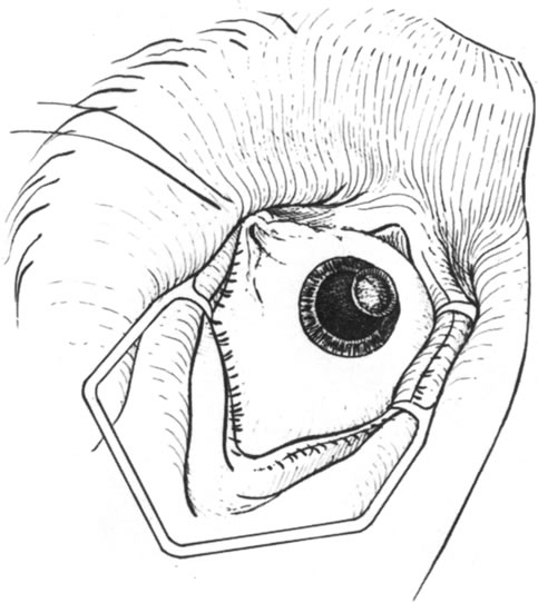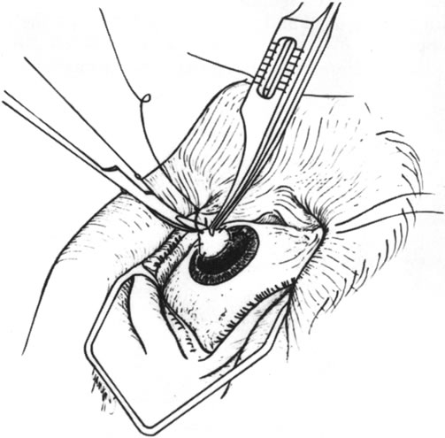 Endothelium and Descemet's membrane can be readily removed before use of the tissue. For a peripheral deep bed and a small graft, full-thickness donor tissue may be obtained from the center of the donor cornea, making it thinner than the recipient bed. Donor tissue that is too thick may ride anterior to the recipient cornea and become disrupted by patient blinking. Once the donor tissue is prepared, it is sutured into the recipient bed with interrupted or continuous sutures (Figs. 13 and 14). Materials other than cornea may be used, such as sclera or periosteum, although they are more difficult to work with than cornea.