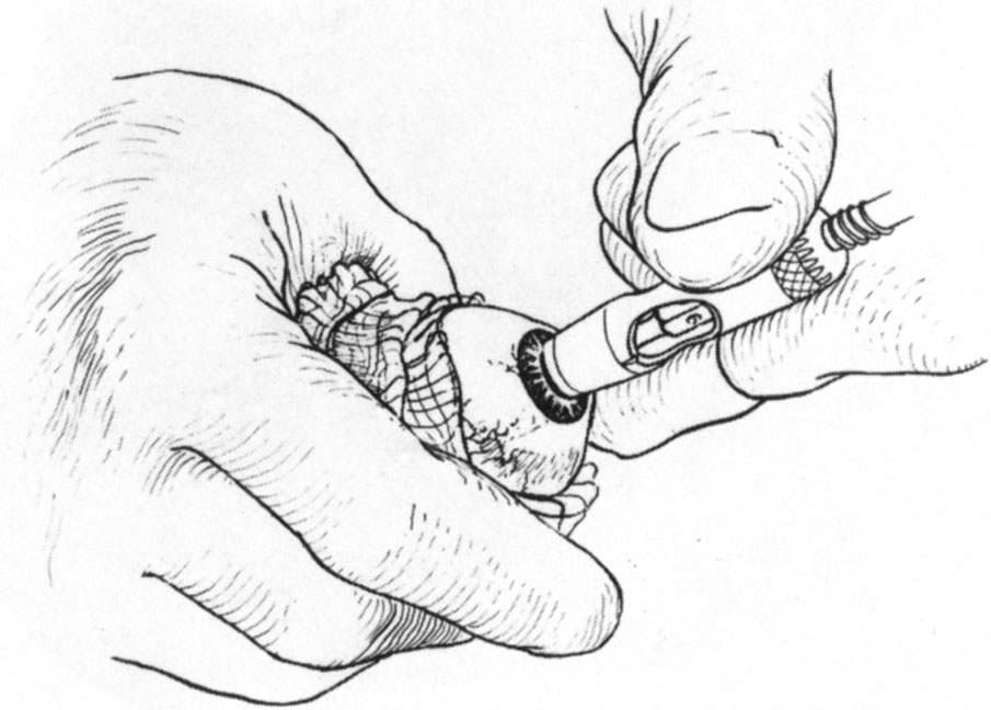 problem so that ulceration and perforation will not recur. With infectious processes, appropriate antimicrobial therapy must be initiated. Often, 24 hours of appropriate antibiotic treatment is carried out in bacterial perforations before definitively treating the perforation. In situations in which eyelid deformity has led to the problem, the eyelid abnormalities can be addressed concurrent with the treatment of the perforation. The same is true of patients with dry eyes in whom tear replacement, punctal occlusion, and other measures can be carried out at the same time as treatment of the perforation. With decreased corneal sensation, tarsorrhaphy can be performed after treatment of the perforation. In inflammatory conditions, immunosuppressant treatment may be necessary coincident with definitive repair and systemically or topically after repair.4 Definitive, that is, reparative, treatment of corneal perforation depends on the cause, location, size, and status of treatment of the underlying condition. Accompanying problems such as endophthalmitis and cataract may also play a role in the decision on definitive treatment. Self-sealing perforations may need no reparative treatment. These perforations may occur with shelved lacerations or with small puncture wounds in which tissue swelling occludes the perforation tract. Wounds that are sealed by tissue prolapse usually require repair. Self-sealed wounds with tissue displacement may also be best repaired to reduce the likelihood of induction of irregular astigmatism. Very small perforations with no associated tissue displacement may be amenable to the use of patching or soft contact lens placement. This is most likely to be effective in small leaks evident only with pressure or in descemetoceles in which tissue stabilization is essential to allow healing and in which the inciting process is under control.5 Small dry eye perforations are perhaps the most responsive to this approach. When soft contact lenses are used, frequent follow-up is essential, and more aggressive techniques may be necessary if this fails. The use of tissue adhesives is an appealing approach to treatment of small perforations or descemetoceles with impending perforation. The advantage is that the adhesive may be applied under topical anesthesia at the slit lamp or in a minor procedure room. The disadvantages are that the glue may induce significant inflammation, may be uncomfortable for the patient, may adhere inadequately, may serve to harbor organisms once polymerized,6 and is often effective only in small perforations that can be readily dried. The tissue adhesives most commonly used in the United States are cyanoacrylates, usually isobutyl or higher alkyl compounds. None of these are approved for ophthalmic use by the Food and Drug Administration. 2-Octyl cyanoacrylate (Dermabond, Ethicon, Somerville, NJ) is approved by the U.S. Food and Drug Administration (FDA) for use on skin and has been effective in sealing corneal perforations. These substances polymerize rapidly when in contact with water. Various techniques have been described for the use of tissue adhesives. All require débridement of necrotic tissue and epithelium surrounding the perforation, drying of the area to which the glue is to be applied, and application of the least amount of glue that can cover the defect. Drying of the defect can be carried out with cellulose sponges, and air or viscoelastic may be placed behind the perforation to separate tissue and reduce the fluid present.8 The glue itself may be applied to a small plastic disk and then placed over the perforation (Fig. 3), applied directly from the tip of a fine needle attached to a tuberculin syringe,9 or applied with a specially made plastic applicator (Squeez-ett, Ellman Manufacturing Co, Hewlett, NY).10,11 The glue may come off and need to be reapplied, at times repeatedly. Usually, because of the rough surface of the polymerized glue, a bandage soft contact lens is placed on the eye after the glue has polymerized. The glue may be left in place until there is obvious healing of the perforation, until the glue spontaneously loosens because epithelium has grown beneath it, or until a more definitive procedure such as keratoplasty is carried out. Fibrin adhesives (e.g., Tisseel, Immuno Canada, Ltd) may be used in a similar fashion but have less inherent strength than the cyanoacrylates and have been used less frequently in the United States.12 Photopolymerized sealants are also being studied. These have the advantage of more controlled polymerization and hardening through laser irradiation after adhesive placement rather than the uncontrolled, very rapid polymerization seen with the cyanoacrylates.13