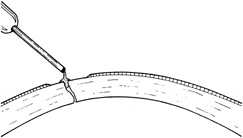 Temporary sutures may be used if the initial placement of deep definitive sutures would cause loss/flattening of the anterior chamber. These temporary sutures should be placed without distorting the wound. Accurate placement of the final definitive sutures can be achieved subsequently. The number of temporary sutures should be minimized, however, to prevent undue trauma to the wound margins and surrounding stroma. For corneal suturing, 10-0 monofilament nylon on a fine spatula-design microsurgical needle is used. This suture causes little tissue reaction, keeping vascularization and scarring at a minimum. Even finer 11-0 nylon suture may be used for lacerations near or involving the visual axis. Computed corneal topography analysis of corneal suturing techniques has suggested strategies designed to ensure adequate wound closure, minimize corneal scarring, and restore the native corneal contour.6,7 A number of options are available for suturing a corneal laceration. Tissue margins should appose as precisely as possible while suturing. The simplest method is to progressively halve the wound with simple interrupted sutures. Corneal sutures should be approximately 90% to 95% depth through the stroma, 1.5 mm in length, and of equal depth on each side of the wound. Shallow sutures create internal wound gape, whereas sutures of unequal length and depth on each side of the wound result in wound override. Sutures should generally not be passed through 100% thickness because the tract may theoretically act as a conduit allowing microorganisms from the external surface to enter the eye. For shelved lacerations, sutures should be placed equidistant with respect to the internal aspect of the wound and tied with minimal tension to achieve good tissue apposition, avoiding wound slippage with consequent tissue override (Fig. 5). Wounds with edematous or irregular margins generally require longer sutures for closure. Placement of sutures through the visual axis should be avoided. If it is necessary to pass sutures near the visual axis, they may be placed on each side of, but not directly through, the axis itself. In addition, the bite closest to the visual axis may be made shorter, thus avoiding this area (Fig. 6). A “no-touch” technique also may be used to minimize trauma at the visual axis. With this technique, the eye is secured by grasping the globe with forceps away from the cornea. The suture needle end is then placed perpendicular to the corneal surface, and the needle is rotated through the corneal tissue following the needle's curvature (Fig. 7).8
