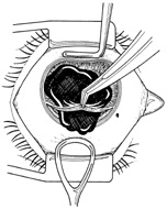 Once incarcerated or prolapsed tissue is excised or repositioned, the corneal laceration is sutured as described earlier. Careful inspection is warranted once closure is complete to ensure that no tissue incarceration persists. The anterior chamber should be filled through the paracentesis site, and wound integrity should be ascertained. CORNEAL LACERATIONS WITH LENS OR VITREOUS INVOLVEMENT. Perforating injuries may also have lens and vitreous involvement. Direct and indirect forces may damage the lens capsule, causing cataract formation. Penetration or rupture of the lens capsule often leads to lens opacification. Blunt trauma may result in globe distortion with equatorial expansion, which can cause capsular rupture or result in dehiscence of zonules with consequent lens subluxation or dislocation. Vitreous may find its way around the lens into the anterior chamber when loss of zonules occurs. Careful preoperative and intraoperative assessment will dictate whether lens removal is required at the time of primary repair. Removal of a cataractous lens rarely needs to be done in the emergency setting. In particular, there are some situations in which lens removal in the acute setting is not recommended. For instance, a fibrinous anterior chamber reaction and pupillary membrane may occasionally masquerade as a flocculent cataract10 or poor visualization secondary to an edematous cornea may make intraocular surgery hazardous. However, if surgical visualization is good, it is preferable to complete all surgical interventions at one setting.11 If any doubt regarding lens clarity exists, the lens should be left in place and, if necessary, removed at a later date. There are other situations in which primary removal of the lens is indicated. A lens with a disrupted capsule and flocculent cortical material liberated into the anterior chamber should be removed at the primary setting in an effort to prevent phacogenic postoperative inflammation. In cases in which vitreous is involved with lens remnants, this may be best addressed in the initial surgery. In addition, when it is clear that a lens is cataractous and surgical visualization is good, the lens may be removed in the primary operation.12,13 Lens removal should take place only under controlled circumstances with proper instrumentation. A cataractous lens with an intact capsule and no liberated cortical material may be removed at a later date. With lens removal, attention should first be paid to any prolapsed or incarcerated tissue. This should be repositioned or excised, and the corneal laceration should be sutured and the anterior chamber re-formed as described. The nature of the injury will suggest the surgical technique used for lens removal. If the lens capsule remains intact, standard phacoemulsification or extracapsular cataract extraction may be performed, making every effort to preserve the integrity of the posterior capsule. In children and young adults, a soft cataractous lens may be removed through a small incision using manual or automated aspiration. When extracting the nucleus in the patient post-trauma, one should be aware of the possibility of poor zonular support. Should zonular weakness, dialysis, or loss be present, a capsular tension ring (CTR) may be used. Implanting a CTR may decrease intraoperative zonule dehiscence, subluxation of the capsular bag, and posterior capsular rupture. A CTR inserted before phacoemulsification will permit support of the capsular bag, reestablishing its contour and protecting it from getting aspirated.14 The CTR (Morcher; distributed by FCI Ophthalmics, Inc., Marshfield Hills, MA) comes in three sizes and is usually inserted after capsulorrhexis and hydrodissection. For insertion, it is best to enter the bag in the area of greatest zonular weakness, thus placing stress on the stronger zonules, 180 degrees away. The ring is dialed into the bag using a second instrument (e.g., Y-hook) (Fig. 14). Alternatively, a CTR injector may be used.