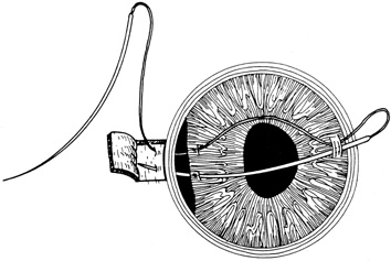 If the lens capsule is ruptured, vitreous is involved, or the lens is subluxated or dislocated, microvitrectomy instrumentation should be used, because caution must be taken not to exert vitreous traction during lens removal. This may be performed through either a limbal or pars plana approach, depending on the surgeon's preference. It is important to remove all lens fragments from the anterior chamber, using caution to prevent any remnants from receding into the vitreous chamber. Any vitreous remaining in the anterior chamber should be removed to prevent incarceration into the wound. Intraocular lens implantation in the primary trauma setting is a controversial area; however, generally it is associated with a more favorable visual outcome.12,13 The patient's age, the visual and refractive status of the fellow eye, and the ability to use an aphakic contact lens postoperatively are factors in the decision. If the posterior capsule is intact, and the patient's age is appropriate, a posterior chamber intraocular lens may be implanted. Currently, intraocular lenses are used at a much younger age. In cases in which there is inadequate capsular support, posterior chamber lenses may be supported by transscleral or iris sutures (Fig. 15). 15,16 An anterior chamber lens may also be placed in the absence of capsular support after all vitreous and lens remnants are removed. These should likely be reserved for older patients; however, intraocular lens implantation should not be performed if visualization is poor or the eye is severely inflamed and may be deferred if secondary anterior segment reconstructive surgery is anticipated. Moreover, although intraocular lens placement may be preferable in some patients, contact lens correction may afford a better optical result in those patients with irregular astigmatism from a corneal scar.17 In corneal lacerations with lens involvement, posterior capsular rupture with vitreous involvement is not infrequent. The anterior chamber should be carefully visualized to detect any incarcerated vitreous strands that, if present, should be removed from the wound. This helps to prevent complications of chronic inflammation, cystoid macular edema, vitreous fibrosis and retinal detachment, and infection mediated by a vitreous wick to the external environment. Automated vitrectomy (preferably bimanual) is performed. Access may be through the limbus, pars plana, or both depending on the surgical situation and surgeon's preference. An irrigation sleeve may also be used, allowing vitrectomy through a single limbal site or through the wound itself. Once vitrectomy has been performed, cellulose sponges should be used to touch the wound, ensuring that no vitreous remains. If any vitreous is present, Vannas scissors are used to cut below the cellulose sponge, flush with the wound. A vitreous sweep or cyclodialysis spatula may also be used through the paracentesis site to mechanically sweep away any incarcerated vitreous (Fig. 16). Any peaking or movement of the pupil indicates overriding vitreous strands. At the conclusion of vitreous removal the pupil should be round and the wound should be cleared of vitreous incarceration.