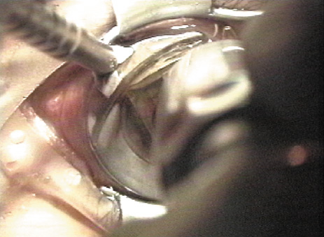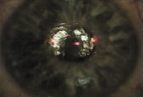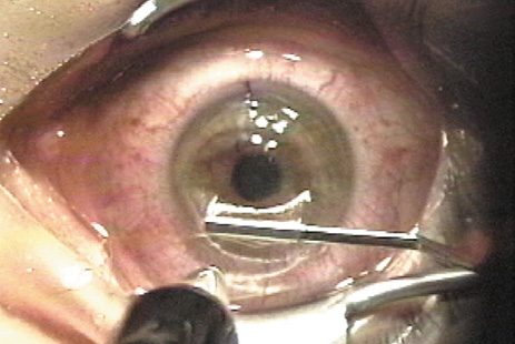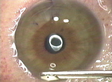 CREATION OF THE FLAP With a microkeratome, the suction ring usually is centered over the entrance pupil, but if using a suction ring that creates a flap of less than 9.5 mm in diameter some surgeons prefer to skew it toward the hinge to ensure that the hinge will not be located within the laser treatment zone. The ring is selected to create a diameter larger than the ablation zone; this is particularly important for hyperopic corrections and astigmatic corrections, as well as wavefront-guided treatments, all of which typically involve large areas of ablation, sometimes as much as a 10-mm diameter. Once the ring is properly positioned, suction is activated. The intraocular pressure should be raised to over 65 mm Hg and verified, preferably with a pneumotonometer (Fig. 4) rather than the less precise plastic Barraquer applanator, because low pressure can result in a poor quality, thin, or incomplete flap. Prior to making the lamellar cut, the surface of the cornea is moistened with proparacaine containing glycerin or with nonpreserved artificial tears. Balanced salt solution is avoided at this point because of the possibility of creating mineral deposits within the microkeratome that can interfere with its proper function. The microkeratome then is placed on the suction ring with the cornea moistened (Fig. 5) and its path is checked to assure that it is free of obstacles such as speculum, drape, or overhanging eyelid. The microkeratome then is activated, passing over the cornea (Fig. 6) until halted by the hinge-creating stopper, after which the microkeratome head is reversed off the cornea. Depending on the model, epithelial defects may be reduced by lowering the vacuum or discontinuing the suction during the reversal; other models require vacuum to remain at full pressure during reversal.