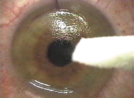 With the IntraLase femtosecond laser, the docking platform suction ring also is typically centered over the pupil. After docking the cone and applanating the cornea, the surgeon can further shift centration electronically to the desired position. The laser scanning process then is activated, and the patient is verbally reassured during the process to maintain a steady upward gaze. THE EXCIMER LASER ABLATION SYSTEM The excimer laser system then is focused and centered over the pupil and the patient is asked to look at the fixation light. The flap is reflected (Fig. 7) and the patient is asked to continue to fixate. If the surgeon wishes to check bed thickness, an ultrasonic pachymeter is applied at this point (Fig. 8). The lights in the room and laser may need to be adjusted in order to allow the patient to be able to continue to visualize the fixation light through the irregular stromal surface after the flap has been lifted. If moist, the stromal bed is dried with a microsurgical debris-free sponge (Fig. 9). The tracking system, if present, usually is activated at this point, followed by application of the excimer laser ablation. With or without a tracking device, the surgeon must monitor the patient to assure that the patient's fixation is maintained (Fig. 10). It is important to initiate the stromal ablation promptly, before excessive stromal dehydration has taken place. However, if centration is lost the ablation should be halted and fixation regained prior to finishing the treatment. The amount of ablation is dependent upon each surgeon's individual nomogram developed based upon monitoring outcomes. Major variables that some but not all surgeons find to be important include: specific laser, individual surgeon, amount of correction, gender, and age.
