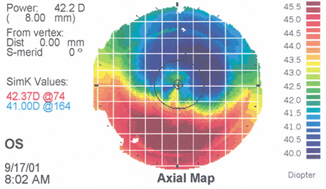 INTERFACE DEBRIS Debris in the interface occasionally is seen postoperatively. The principal indication for intervention, with flap lifting, irrigation, or manual removal of debris, occurs when the foreign material elicits an inflammatory reaction. Small amounts of lint, nondescript particles, or tiny metal particles from stainless steel surgical instruments usually are well tolerated. On the other hand, although a small amount of blood that has oozed into the interface from transected peripheral vessels may be tolerated, any significant amount of blood usually elicits an inflammatory cell response and should be irrigated from the interface. Use of a topical vasoconstrictor such as epinephrine to facilitate coagulation at the time of replacing the flap helps to minimize this problem. ECTASIA The importance of an adequate residual stromal bed to prevent structural instability and postoperative corneal ectasia is discussed in the section on preoperative evaluation. Current standards recommend a minimum residual stromal bed of at least 250 μ after completion of the ablation.94 Although keratectasia usually is associated with LASIK performed for higher myopic corrections; in thin corneas or patients who have had multiple laser ablations, cases of ectasia have been reported in corrections as low as −4 D where the residual stromal was believed to be thicker than 250 μ.95 In many of these cases, later examinations have shown that the microkeratome created a flap thicker than expected, resulting in a thinner residual stromal bed.96 In other cases, preoperative subtle keratoconus or other ectasias may have been present. In many cases, good vision can be restored with a rigid gas permeable contact lens. The use of implanted intrastromal polymethylmethacrylate segments to reduce the irregular astigmatism is under investigation.97 Penetrating keratoplasty may be required in extreme cases. |
