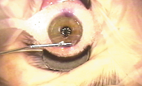PREPARATION Prior to the LASIK procedure, the excimer laser beam is tested for proper homogeneity and fluence in an identical fashion to PRK preparation. The microkeratome and vacuum unit are assembled, carefully inspected, and tested to ensure proper function. The importance of meticulous maintenance of the microkeratome cannot be overemphasized. A new blade is placed within the microkeratome and, in models that permit different heads for different thickness flaps, the desired head size verified. The patient may receive a mild sedative such as oral diazepam 5 to 10 mg approximately 30 minutes prior to the procedure. Topical anesthetic drops are instilled and the skin is prepped with povidone iodine or another skin antiseptic. Some surgeons drape the skin or lashes with a plastic drape or Steri-Strips, whereas others feel this is unnecessary and a potential source of material to jam the microkeratome. A lid speculum is placed that has a configuration to accommodate the suction device and the path of the microkeratome (Fig. 2). The cornea may be marked with an optical zone marker to assist in proper centration of the suction ring and one or more periradial lines usually are placed to ensure proper realignment of the flap (Fig. 3).