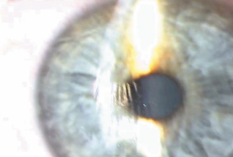 Corneal Perforation Corneal perforation is a rare but devastating intraoperative complication that can occur if the microkeratome is not properly assembled, or if the depth plate of the microkeratome is not properly placed in an older model microkeratome. Therefore, it is imperative that the surgeon double check that the microkeratome has been properly assembled prior to proceeding. Most microkeratomes are now made with a prefixed depth plate so that this source of error is eliminated. Corneal perforation also can occur when LASIK is performed on an excessively thin cornea.71 Therefore, corneal thickness must be measured with pachymetry prior to performing LASIK, especially in patients undergoing retreatment. DRY EYE AND CORNEAL SENSATION The occurrence and etiology of dry eye syndromes after laser ablation procedures, particularly LASIK, is discussed in the preceding in the preoperative evaluation. The surgeon must carefully monitor the patient postoperatively for signs of punctate keratitis or more severe manifestations of neurotrophic epitheliopathy. Intensive tear film support with nonpreserved artificial tears, gels and ointments, and the addition of punctal occlusive plugs or cyclosporine drops if lubricants are inadequate, are the mainstay of therapy while awaiting the return of innervation.72 Both the surgeon and patient must remain aware that many patients seeking laser vision correction do so because of contact lens intolerance, and dry eyes are one of the most common reasons for that intolerance.73 That dryness persists, of course, and is transiently worsened during the recovery from the denervation of the flap.74 The patient may perceive the long-term persistent dryness to have worsened and blame the LASIK procedure. Dry eyes are a common cause of transient loss of BCVA after LASIK.75 STRIAE Postoperatively, the flap can slip, resulting in prominent wrinkles and a widened peripheral gutter (Fig. 22). The earlier the flap malposition is recognized and treated, the easier it is to remove potentially visually significant folds.
