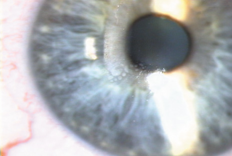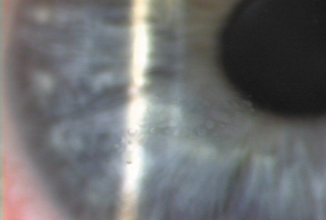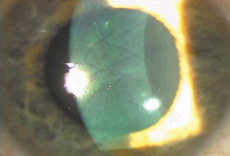 The inflammation generally resolves on its own without sequelae, but severe cases can lead to scarring or flap melting; therefore, many surgeons treat the inflammation with aggressive topical steroids in stages 1 and 2; or, in the more severe cases of stages 3 and 4, irrigation of the interface with balanced salt solution and intense topical steroids. In highly threatening cases a brief course of systemic steroids also may be employed. Although initial attempts to identify a single cause of interface keratitis centered on debris or solution on microkeratome blades, subsequent cases documented inflammation after flap-lift retreatments without the use of a microkeratome. In one case, interface inflammation was observed after epithelial disruption without lifting the flap at all. Most likely, the inflammation is a nonspecific reaction to corneal trauma and the presence of an interface becomes a potential space in which white blood cells can aggregate. When a cluster of DLK occurs, a common source is a toxic biofilm that builds up in the reservoir of the steam sterilizer.88 INFECTIOUS KERATITIS It is important to differentiate sterile interface inflammation from potentially devastating infectious inflammation. Infection within the interface can lead to flap melting, severe irregular astigmatism, and corneal scarring requiring penetrating keratoplasty. If infection is suspected, the flap should be lifted and the interface cultured and irrigated with antibiotics.89 The most common infections are from gram-positive organisms, followed closely in frequency by atypical mycobacteria.90 Infection from virtually all organisms has been reported; fungal infection is particularly difficult to treat. If an infection does not respond, amputation of the flap may be necessary to improve antibiotic or antifungal penetration. Fourth-generation fluoroquinolones, gatifloxacin, and moxifloxacin have excellent efficacy against most of the bacteria causing post-LASIK infections, including mycobacteria. An infected LASIK flap after a recurrent abrasion is shown in Figure 20. EPITHELIAL INGROWTH Epithelial ingrowth into the lamellar interface can first be recognized anytime from 2 days to 12 months postoperatively (Fig. 25A).91 Isolated nests of epithelial cells that are not advancing do not need to be treated. However, if the epithelium is advancing toward the visual axis (Fig. 25B), is associated with irregular astigmatism, or triggers overlying flap melting, it should be removed by lifting the flap and scraping the epithelium from the underside of the flap as well as from the stromal bed prior to repositioning the flap. Two series have reported an incidence of epithelial ingrowth requiring intervention after approximately 2% of LASIK procedures. The incidence of epithelial ingrowth is greater in patients who develop an epithelial defect at the time of the procedure and in those undergoing a retreatment with lifting of a pre-existing flap.57,58 Therefore, in these instances, special care should be taken to assure that no epithelium becomes caught under the edge of the flap when it is repositioned. Placement of a bandage contact lens at the conclusion of the procedure also may decrease the incidence of epithelial ingrowth for patients at higher risk of developing this complication. In a few cases of recurrent ingrowth in the same area, placement of a suture may help seal the peripheral flap and discourage recurrent ingrowth.92 In some cases, PRK may be a good option when epithelial ingrowth is challenging and recurrent.93